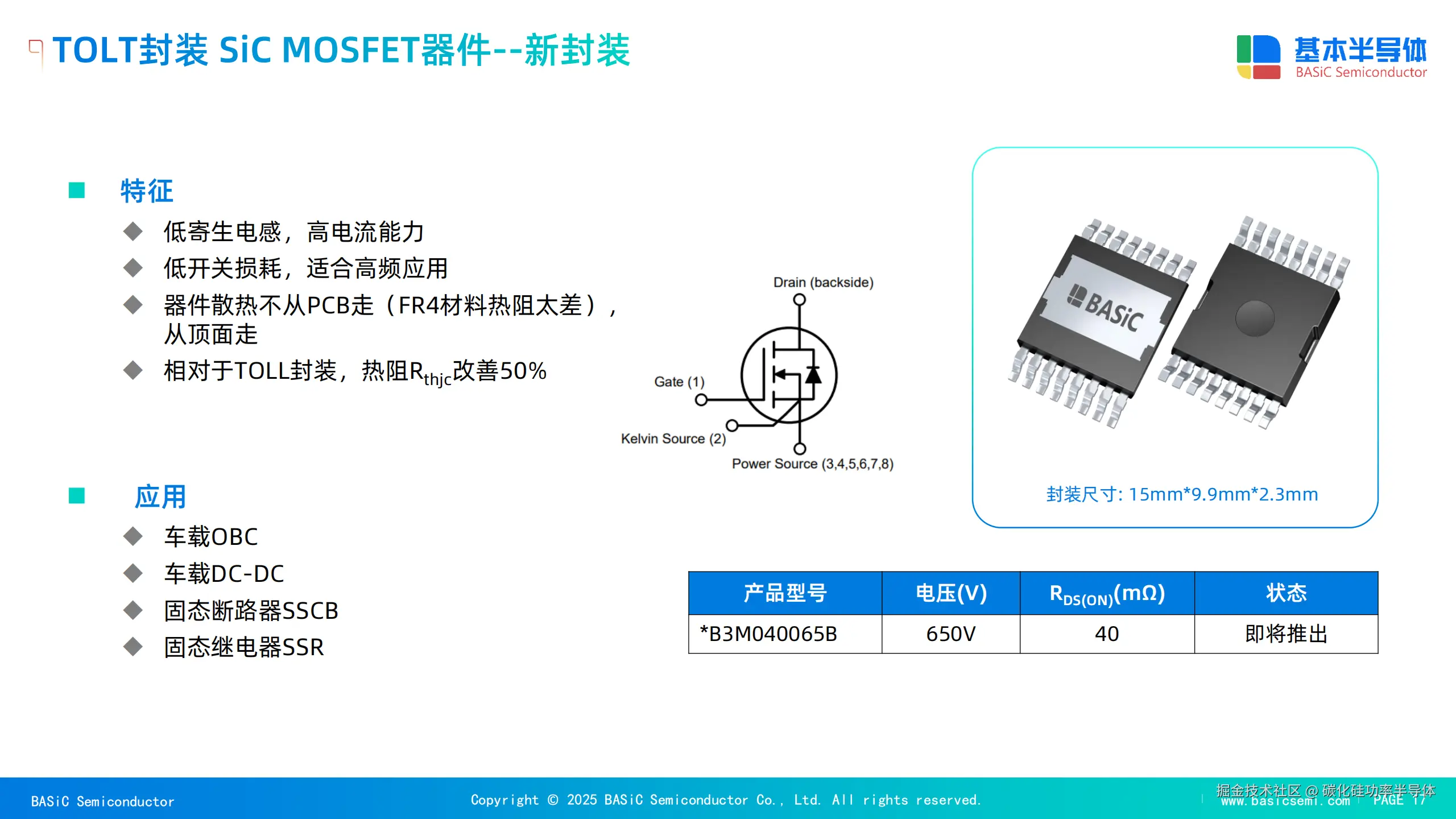 BASIC的 B3M040065Z(650V/40mΩ)FOM值(RDS(on) × Qg)为 2400 mΩ·nC,显著低于CREE(2835)和ST(1687.5),开关损耗降低20%-30%。