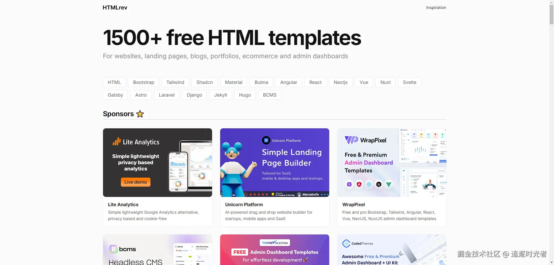 HtmlRev 包含但不限于 HTML、Bootstrap、Tailwind、Shadcn、Material、Bulma、Angular、React、Vue、Next.js、Nuxt、Svelte、Gatsby、Astro 等多种前端框架和技术的模板。