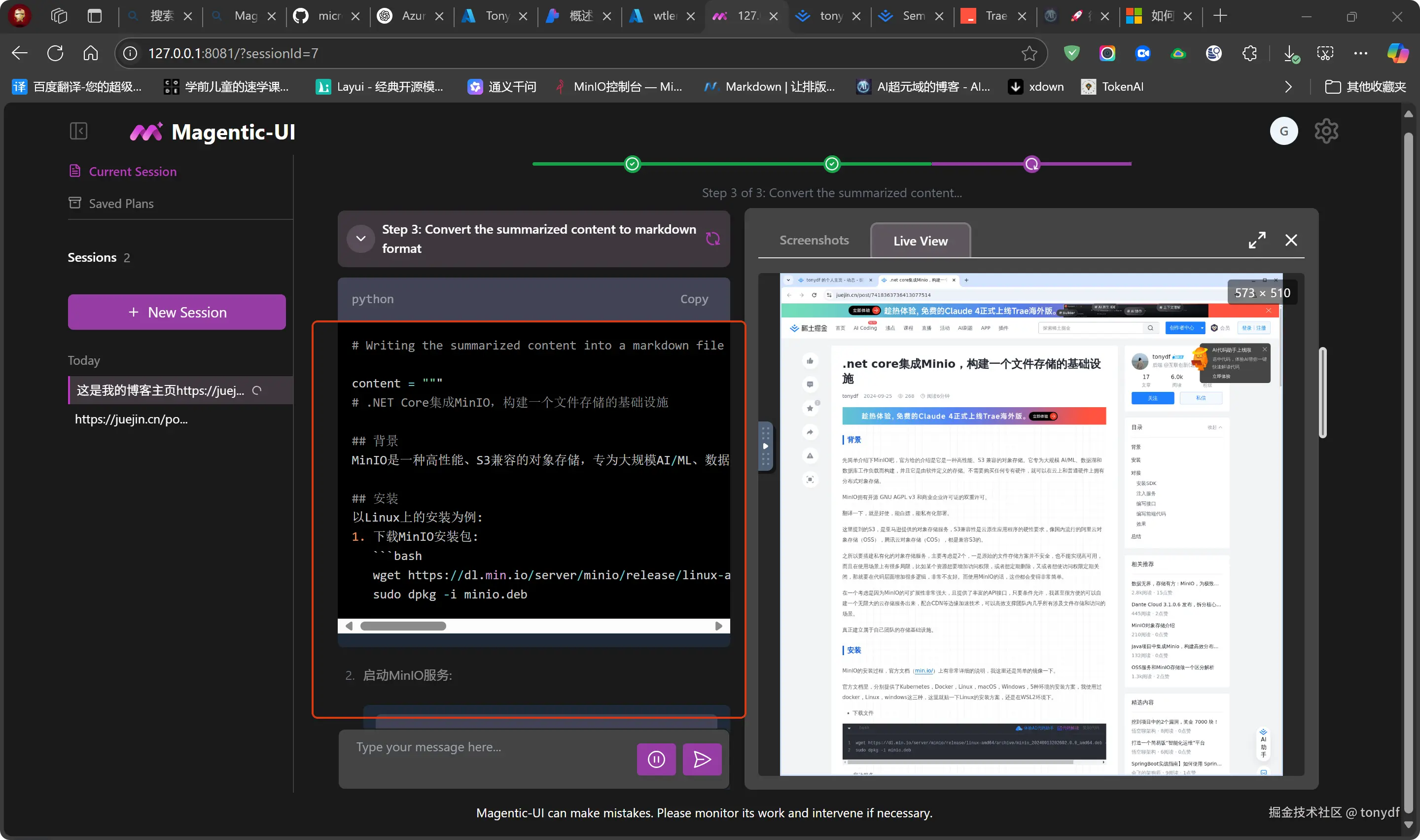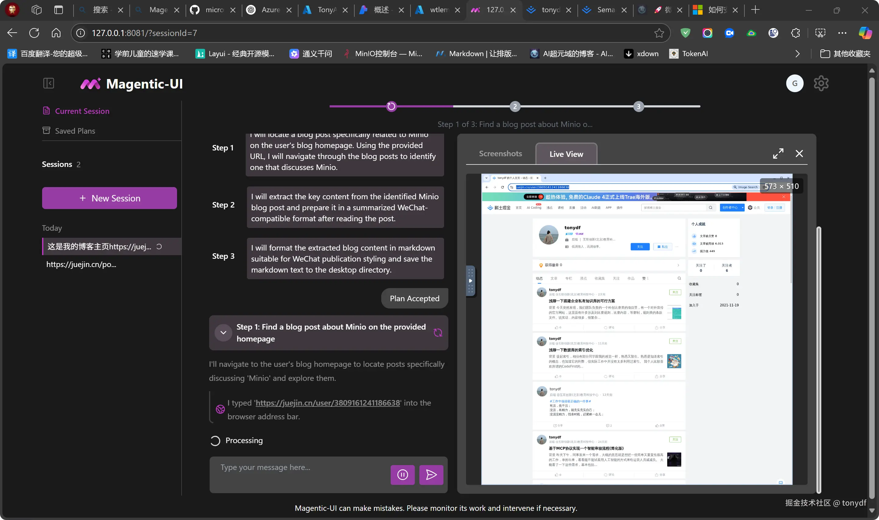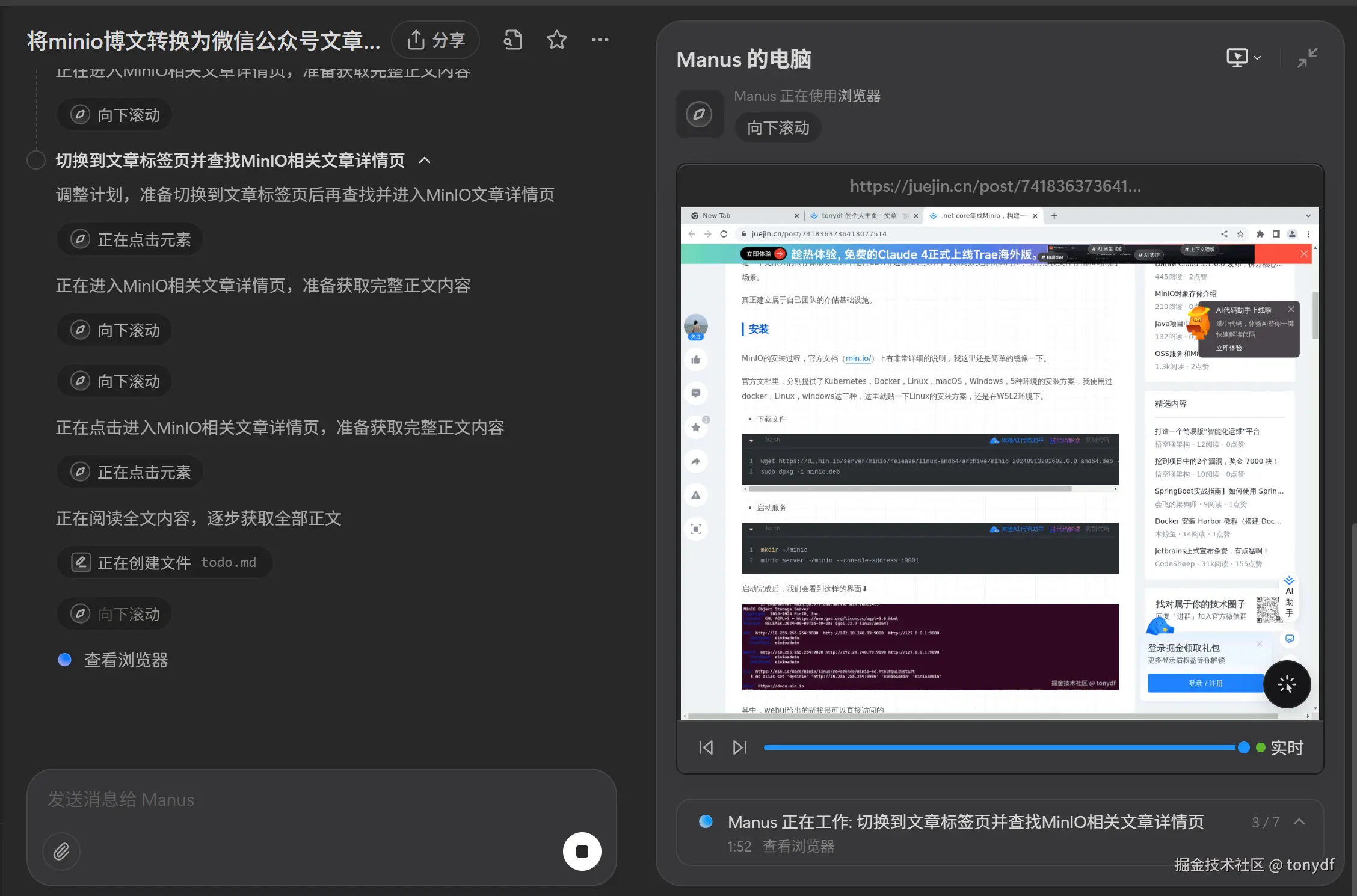 这里,我让他找一下我的掘金主页,然后找一篇我之前写过的博客,再让他总结一下生成一篇公众号文章,看看它的执行效果如何。