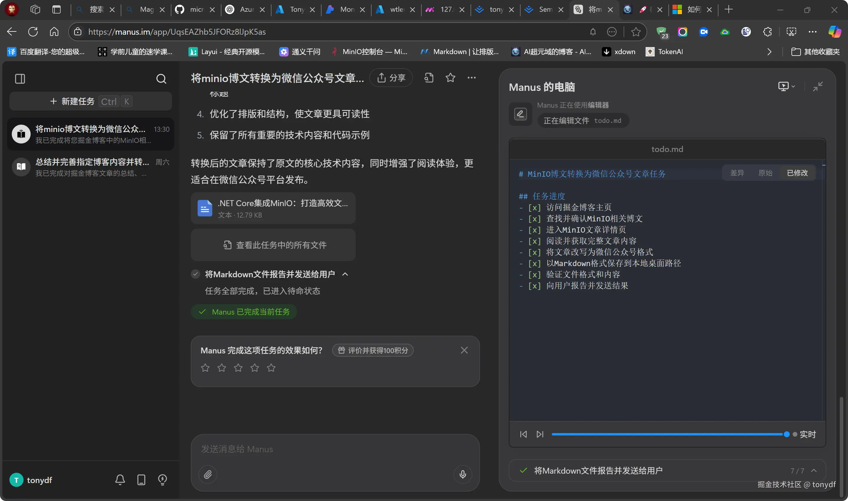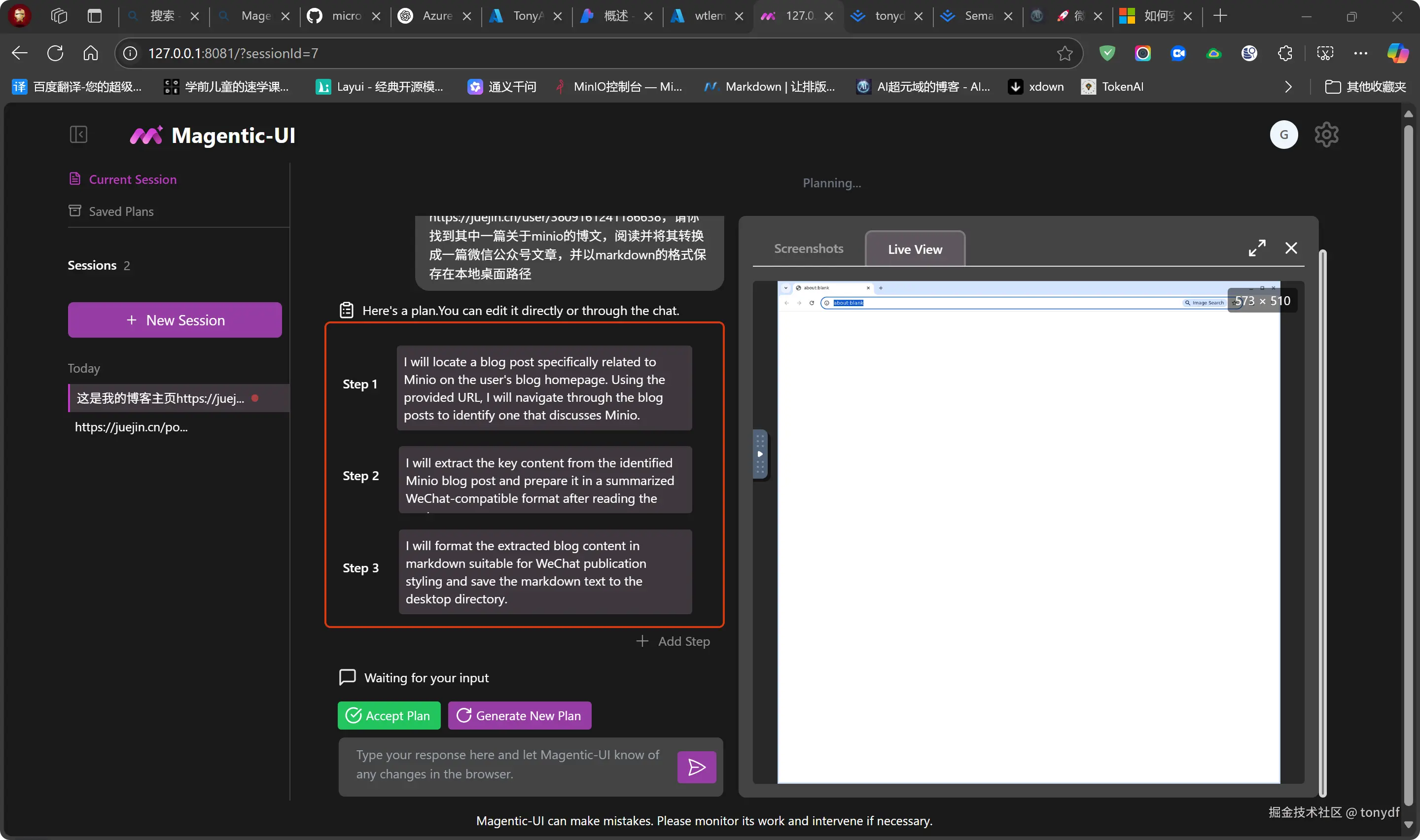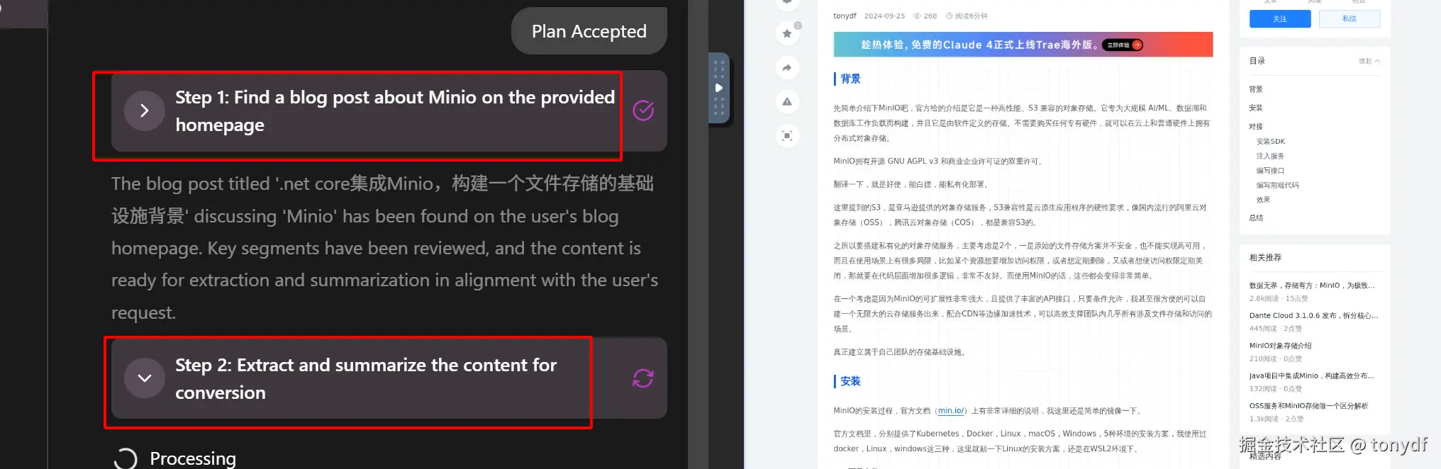 这里,我让他找一下我的掘金主页,然后找一篇我之前写过的博客,再让他总结一下生成一篇公众号文章,看看它的执行效果如何。