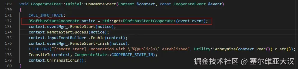 (inlined by) OHOS::Msdp::DeviceStatus::Cooperate::CooperateFree::Initial::OnRemoteStart(OHOS::Msdp::DeviceStatus::Cooperate::Context&, OHOS::Msdp::DeviceStatus::Cooperate::CooperateEvent const&) at /mnt/data/wangyeyu/code_t67_0515/out/rk3568/../../base/msdp/device_status/intention/cooperate/plugin/src/cooperate_free.cpp:172