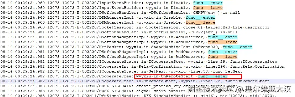 此类问题如果打印了进出日志,此时只会打印进入日志,缺少离开日志,如下:
