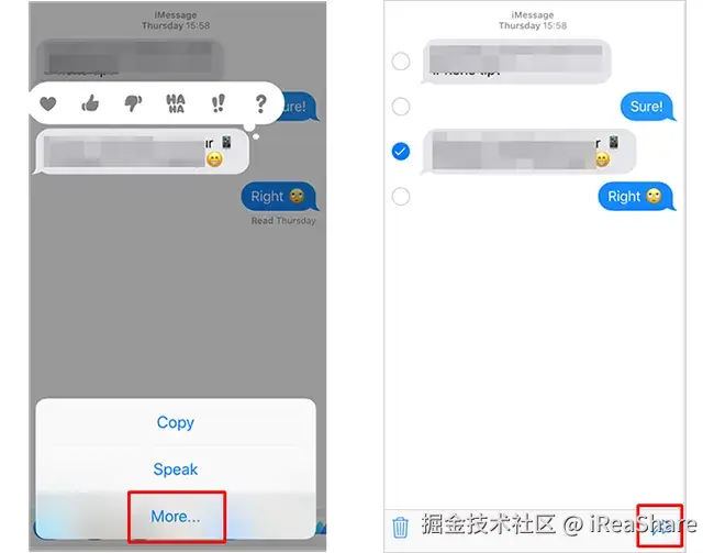 步骤 2: 点击并按住您要发送的消息。将出现一个菜单。点击“更多”选项。这将允许您在对话中选择多条消息。