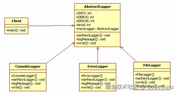 我们创建抽象类 AbstractLogger,带有详细的日志记录级别。然后我们创建三种类型的记录器,都扩展了 AbstractLogger。每个记录器消息的级别是否属于自己的级别,如果是则相应地打印出来,否则将不打印并把消息传给下一个记录器。