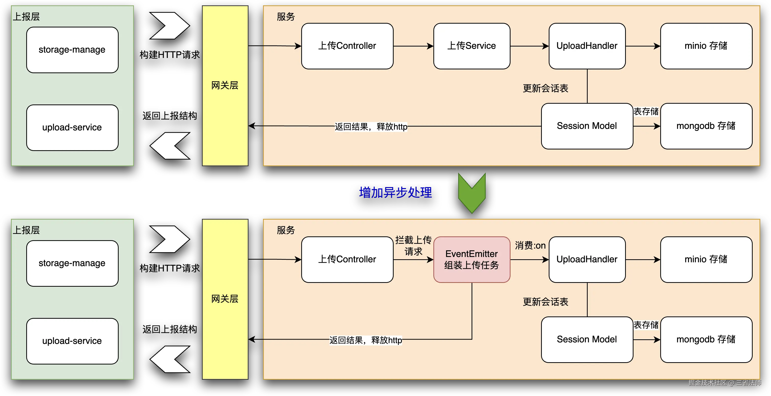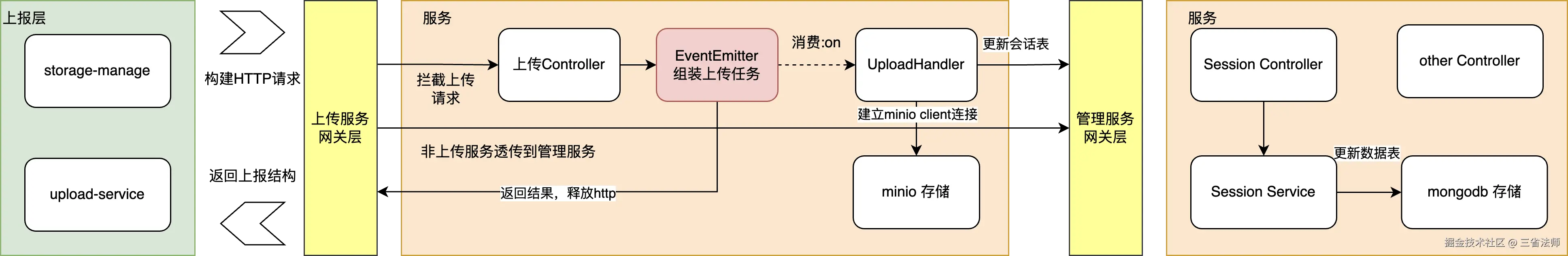 首先我们先通过异步处理和消息队列解耦合业务逻辑,尽快释放Http连接。控制器在收到上报请求之后,创建上传任务,并且向 Node EventEmitter 推送事件,并返回结果释放连接。上传服务监听到事件之后开始读取缓存中的文件,执行任务。