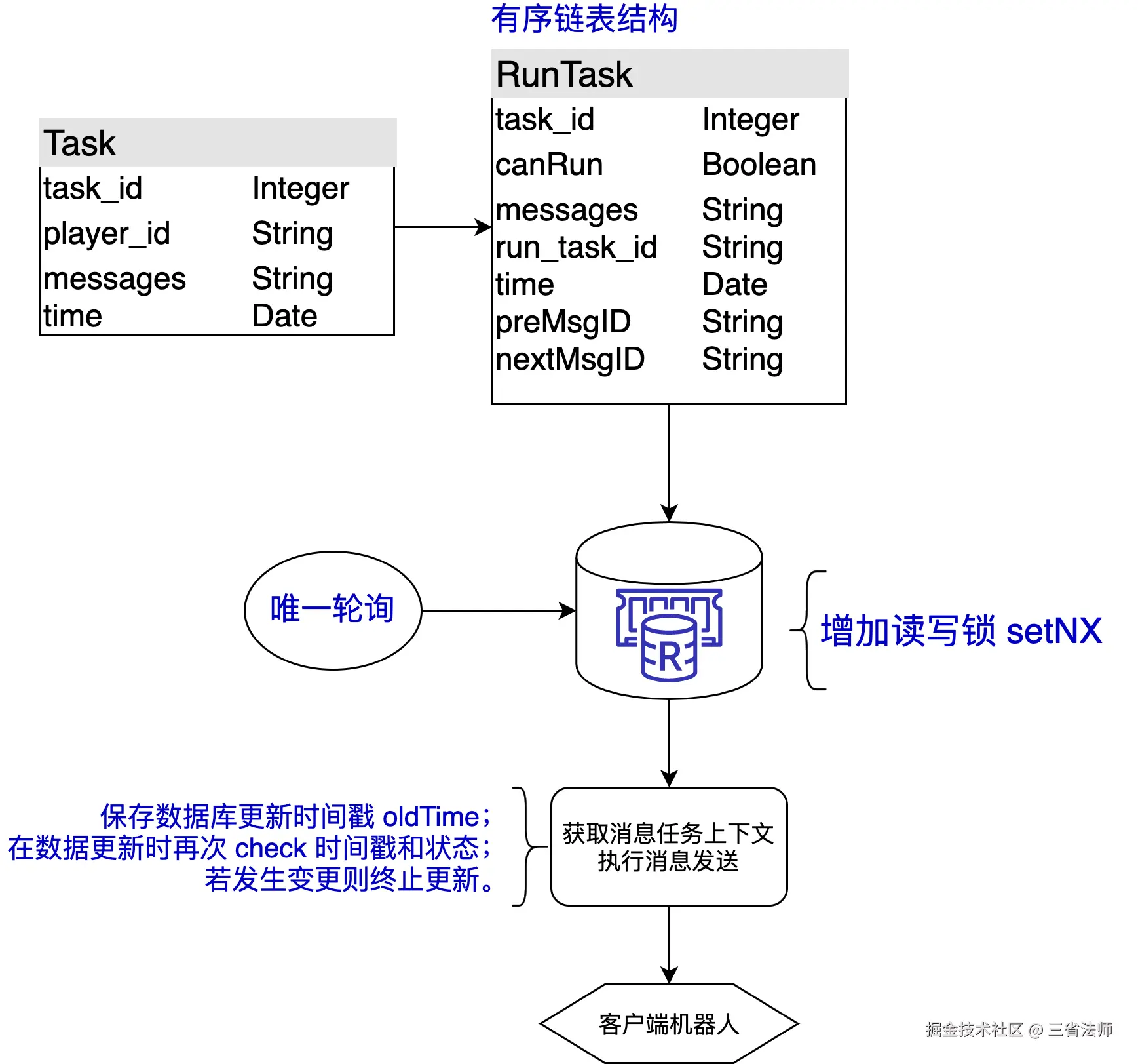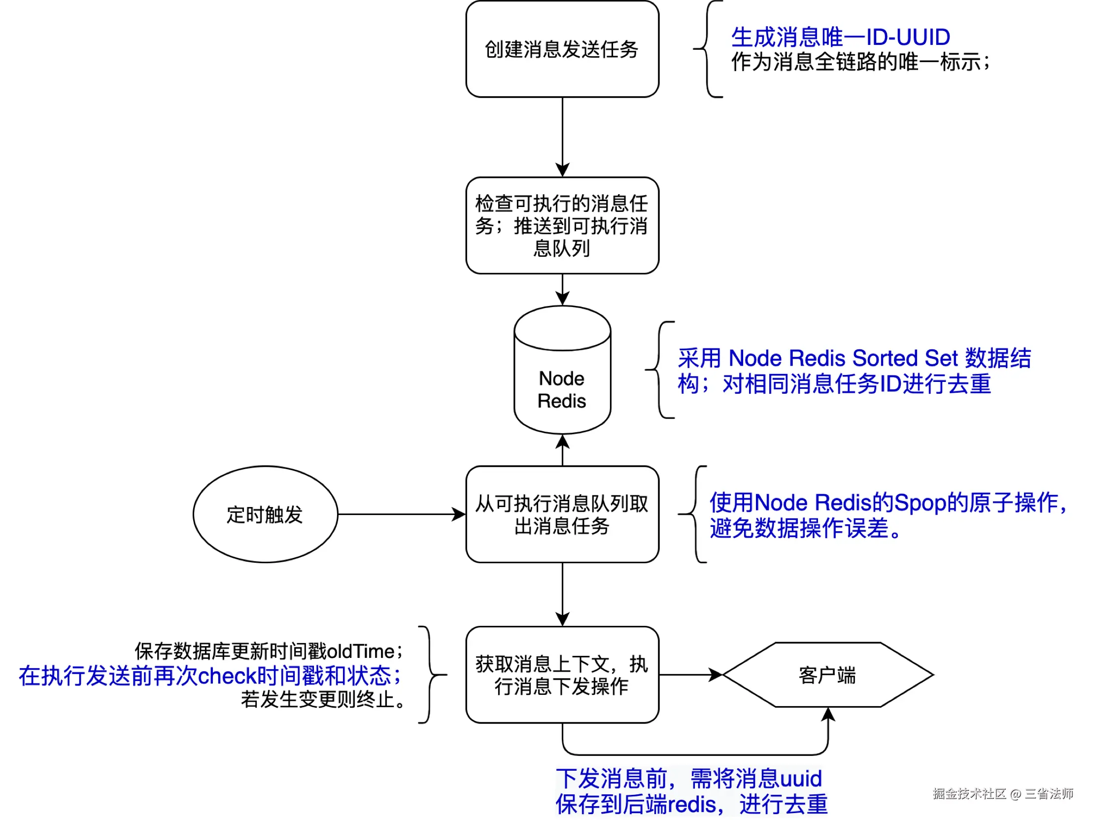 redis setNX分布式锁保证单一进程读取消息队列,不重,不漏,不乱。 - 【状态机设计】消息状态只能从未执行、执行中、执行成功、执行失败