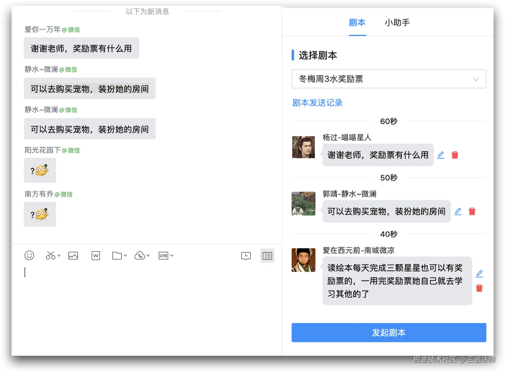 在客户运营过程中,为了标准化运维对于客户管理的标准化过程,保证服务质量,一般都会引入SOP - 标准作业程序(Standard Operating Procedure),简称剧本。这些水军按照自动化的剧本在群组内进行演绎,来启动活跃气氛,促进业务转化。