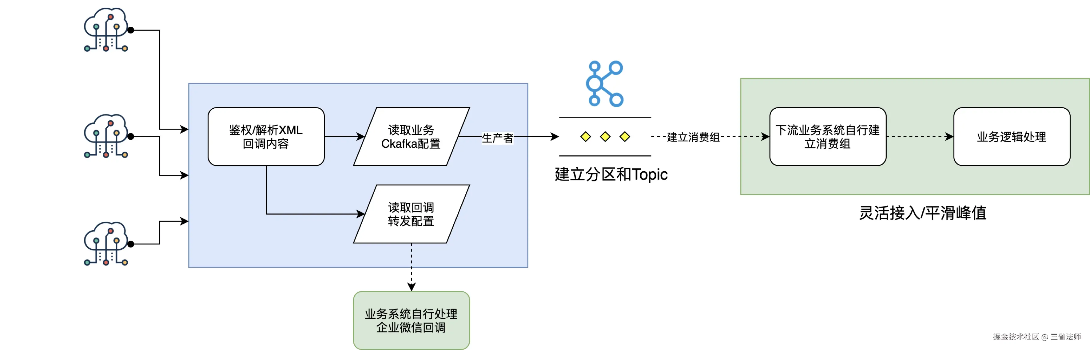 - 可扩展性:提供通用的 Kafka 回调和回调转发接入方案,快速方便企业和业务系统的快速接入。