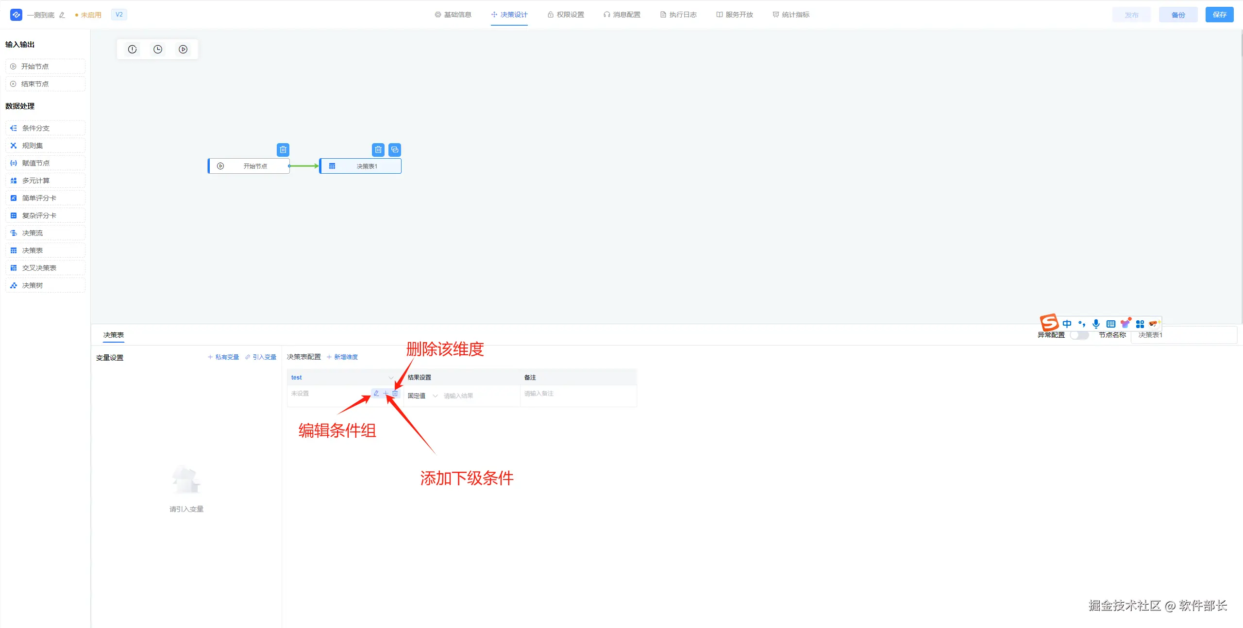 3、可根据实际情况新增或引入变量(需要用到变量进行赋值时),然后在决策表配置点击【新增维度】,即会新增一行配置。多点几次新增维度即会多新增几行。