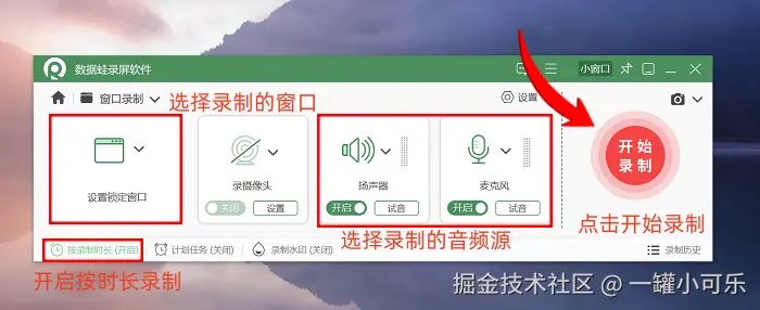 步骤2:选择好录制的窗口后,再设置下音频来源。要是想录电脑系统声音,就把 “扬声器” 打开;要是想录自己讲解的声音,就打开 “麦克风” 。另外,还可以开启 “按时长录制” 功能,软件在录制时间结束后会自动停止录制。全部设置好了之后,点击 “开始录制” 的按钮,就可以开始录屏啦。