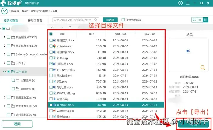 步骤2: 在扫描出来的文件中选择需要恢复的文件,点击勾选后再单击【导出】;在【浏览文件夹】中选择导出文件的存放位置。