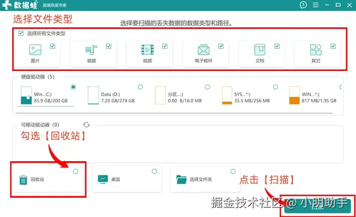 步骤1: 在电脑中打开数据 蛙恢复专家,在上方可以选择自己需要恢复的文件类型,再勾选【回收站】,选完后点击【扫描】;