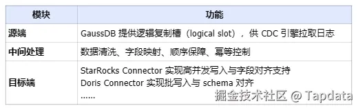 为了满足 GaussDB 的数据入仓等特定需求,TapData 提供了内置的数据连接器(如 StarRocks / Doris Connector),具备以下特性: