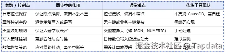 传统数据同步工具在面对 GaussDB 这类新型国产数据库时,普遍缺乏基础支撑能力,无法满足日志捕获、数据一致性控制、实时入仓等核心要求。构建可靠链路,需要在增量解析、链路调度、故障恢复等各个环节进行系统性的重构和优化。