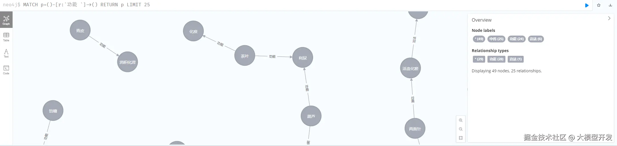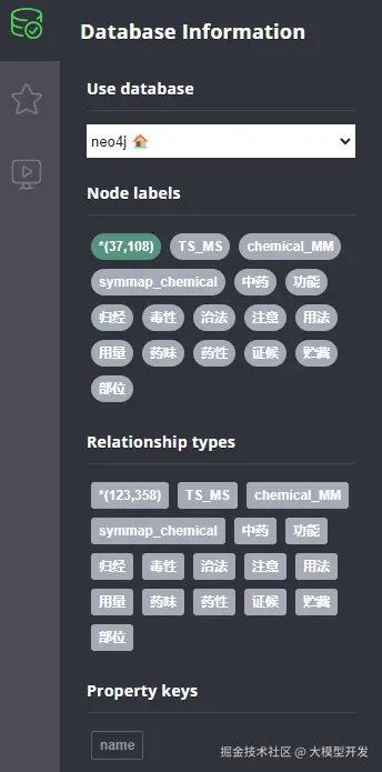 我们可以运行命令或者点击左侧的标签查看知识图谱中的节点和关系: