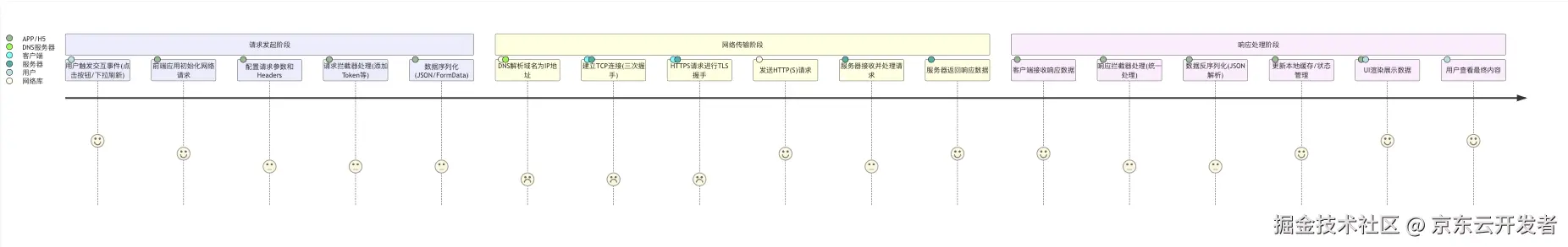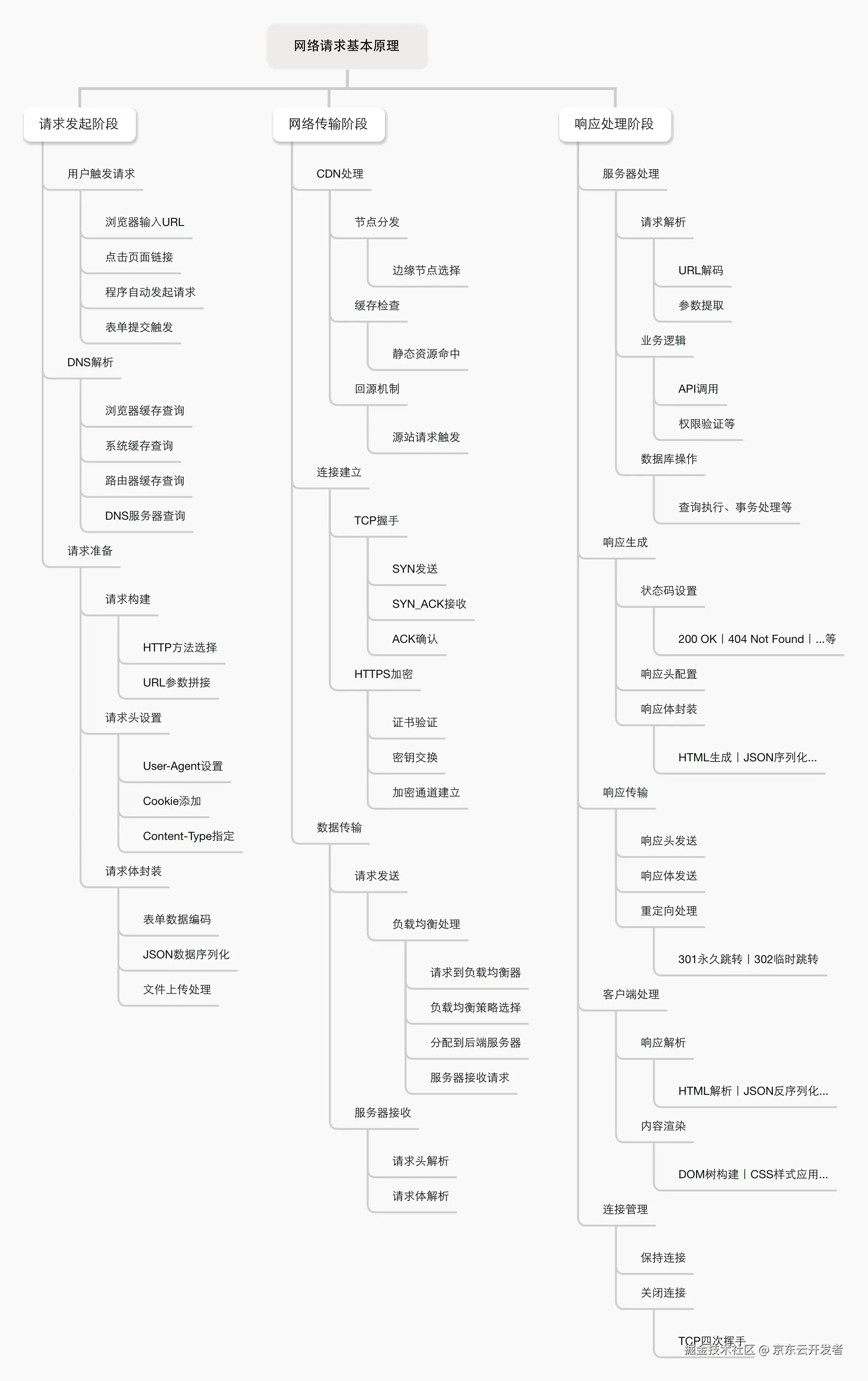 1.2、我们可以网络请求的原理,分析一次网络请求的过程,梳理发现问题或优化的方向,如下图所示,关键节点包括DNS解析、建立链接等去寻找优化点...