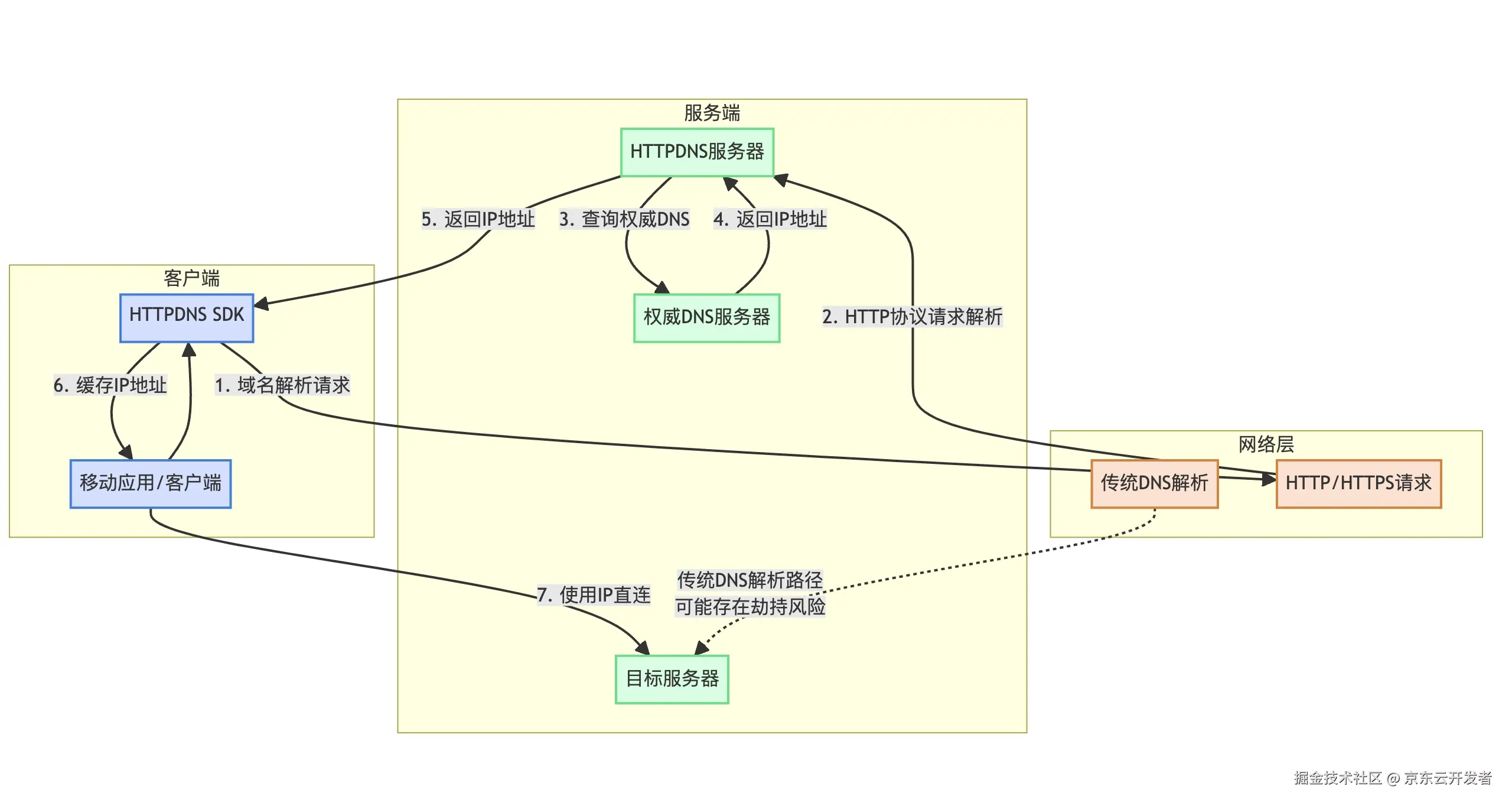 2.1、DNS解析优化: 使用HTTPDNS代替传统DNS,基本原理如下: