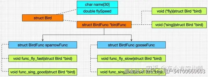 struct Bee 包含函数属性 void (*beeFlowerFunc)(struct Bee *bee) 。beeFlowerFunc 可以动态指定具体的函数。