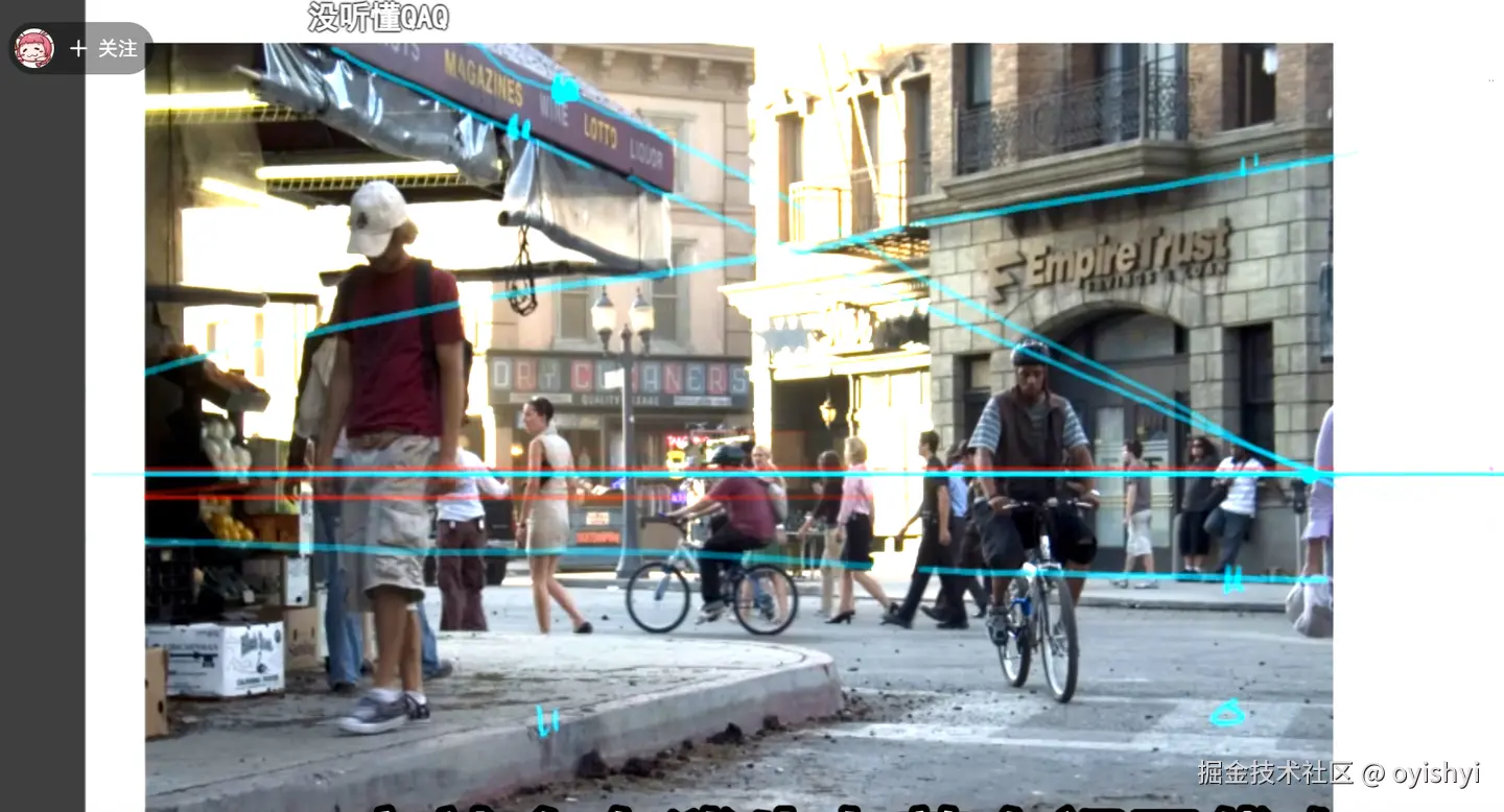 视平线就是假设一张图是人眼看的画,人眼的位置。要找到视平线可以通过找到两个平行于地面的线,然后延长,交点就是视平线的位置了。如下图两对平行线都可以找到这个视平线。