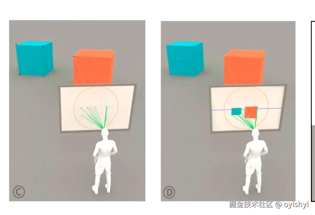 类似下图这样。把物体与眼睛连线,和画布的交点在画布上就会出现这样的形状。就会有近大远小的现象。