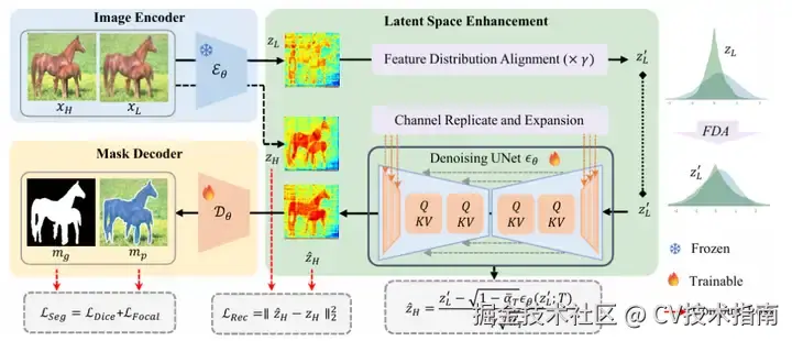 **为此,作者提出了GleSAM,它通过生成式扩散在SAM的潜在空间中重建高质量特征,从而实现对任何质量图像的准确分割。**从低质量特征开始,通过单步去噪生成高质量表示。为了整合LDM的生成知识,将预训练的LDM的U-Net与可学习的LoRA层结合,以适应分割特定特征。此外,为了提高预训练扩散模型和分割框架之间的兼容性,引入了两种有效技术:特征分布对齐(FDA)和通道复制与扩展(CRE)。这些技术弥合了模型之间的特征分布和结构对齐差距。基于SAM和SAM2构建,GleSAM利用了预训练分割和扩散模型的泛化能力,并且只添加了少量可学习参数,可以在四个GPU上高效训练30小时。