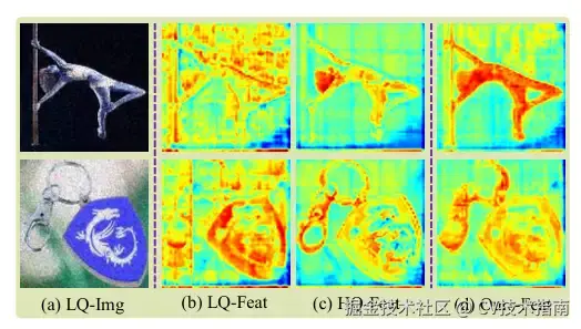图2. 潜在特征的可视化:(a) 低质量(LQ)图像,(b) 从低质量图像中提取的SAM的潜在特征,这些特征包含过多的噪声,破坏了原始表示,(c) 对应清晰图像的高质量(HQ)特征,这些特征比低质量图像的特征更为显著,(d) 通过GleSAM增强后的表示。