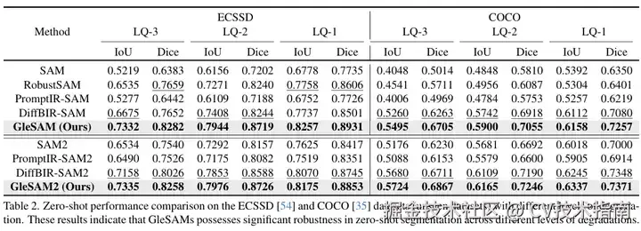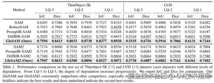 具体来说,将潜在扩散的概念应用于基于SAM的分割框架,并在SAM的潜在空间中执行生成扩散过程,以重建高质量的表示,从而改善分割效果。此外,引入了两种技术来提高预训练扩散模型与分割框架之间的兼容性。该方法可以应用于预训练的SAM和SAM2,只需要极少的额外可学习参数,从而实现高效的优化。还构建了具有更多退化类型和水平的LQSeg数据集,用于训练和评估模型。大量的实验表明,GleSAM在复杂退化上的分割鲁棒性显著提高,同时保持了对清晰图像的泛化能力。此外,GleSAM在未见过的退化上也表现出色,突显了方法和数据集的多功能性。