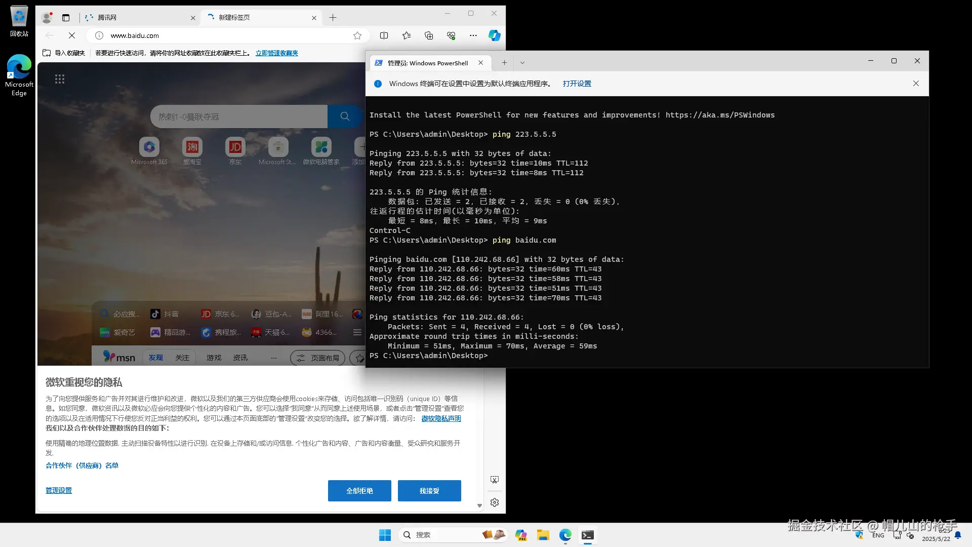看到下图中使用 ping 223.5.5.5 主机 和 ping www.baidu.com 域名,检测后都是可以访问互联网的。唯独使用浏览器访问 www.baidu.com 域名时一直处于无法连接状态,环境中也不存在防火墙拦截、上网行为管理等其他网络限制问题。