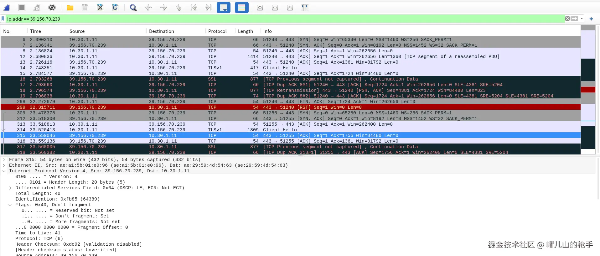 这段报文源IP 10.30.1.11是windows主机出网口, 目的IP 39.156.70.239是百度服务器地址。