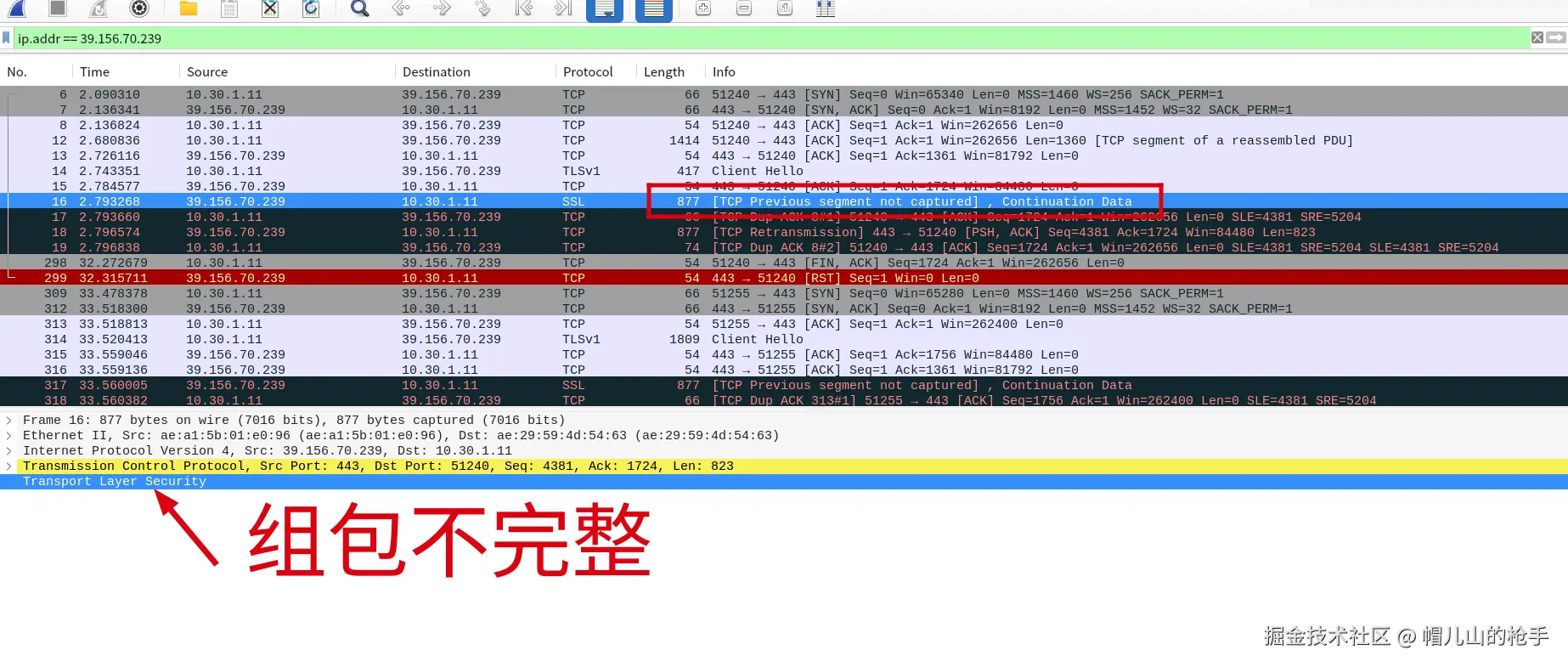 编号 16 ,提示 [TCP Previous segment not captured], Continuation Data 表示TCP 数据流中存在不完整或乱序的数据段。