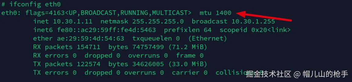 下面找到出网口设备,发现MTU值1400字节,那大概率就是这里进行分片处理后,发送网络包进行重组包导致失败的原因。