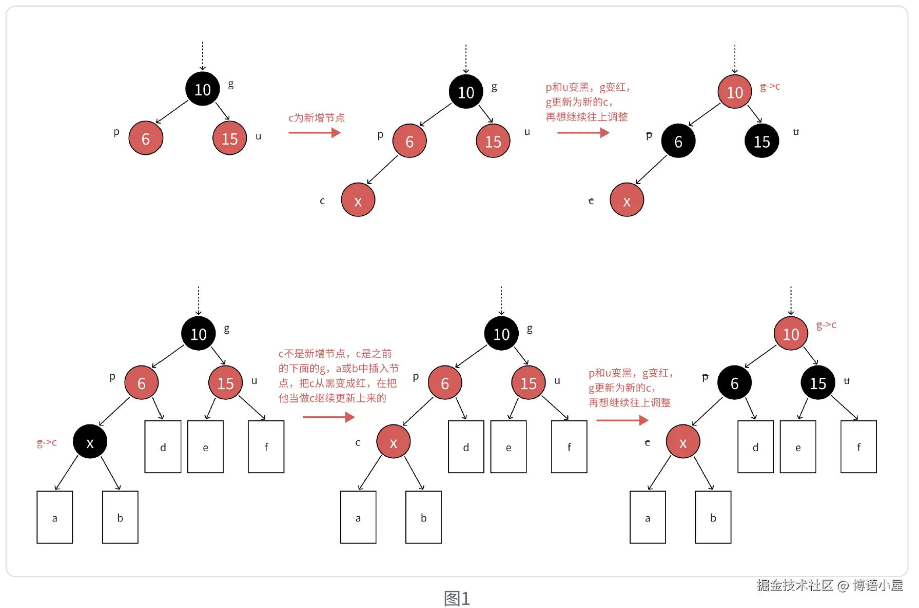 c为红,p为红,g为黑,u存在且为红,则将p和u变黑,g变红。再把g当做新的c,继续往上更新。