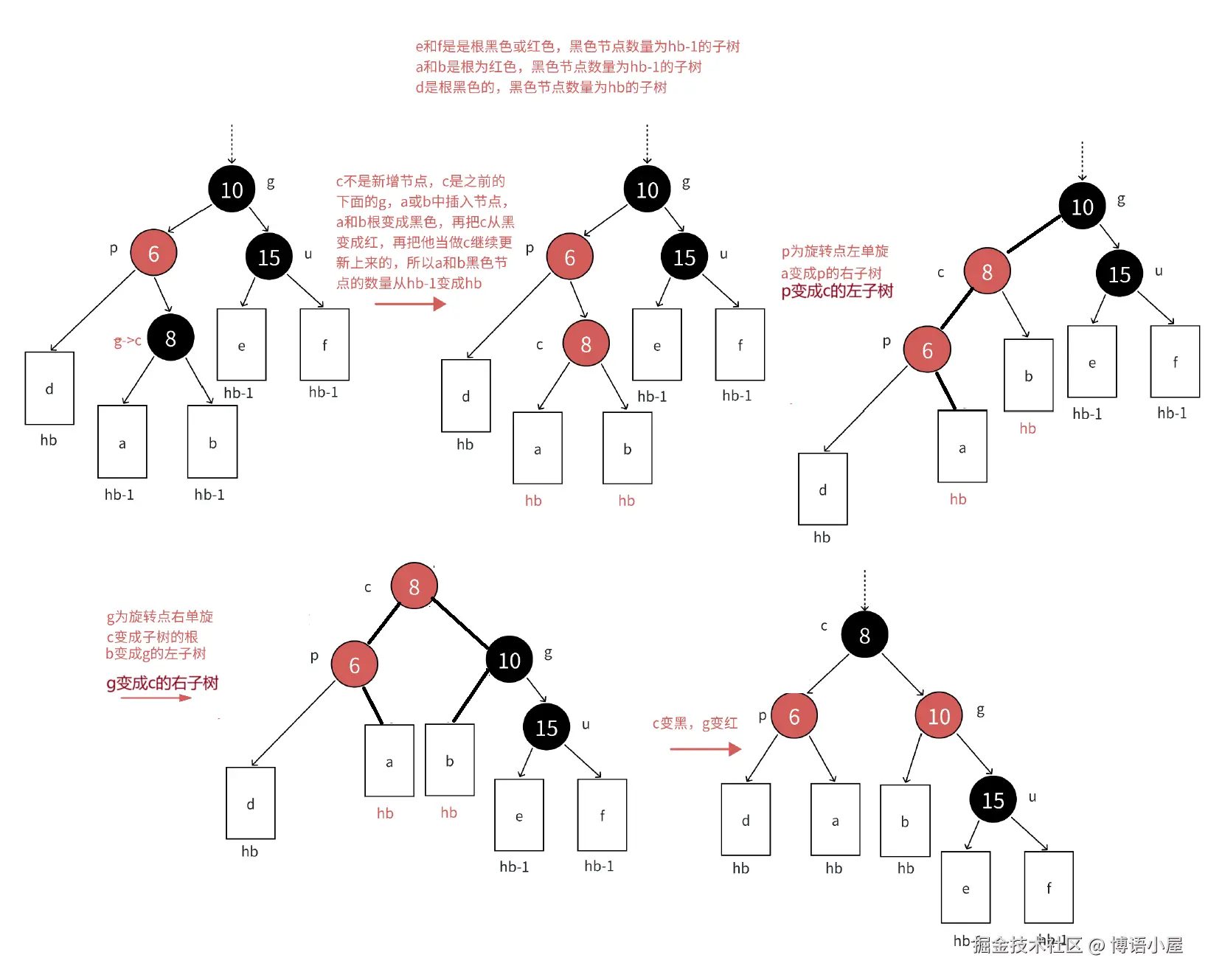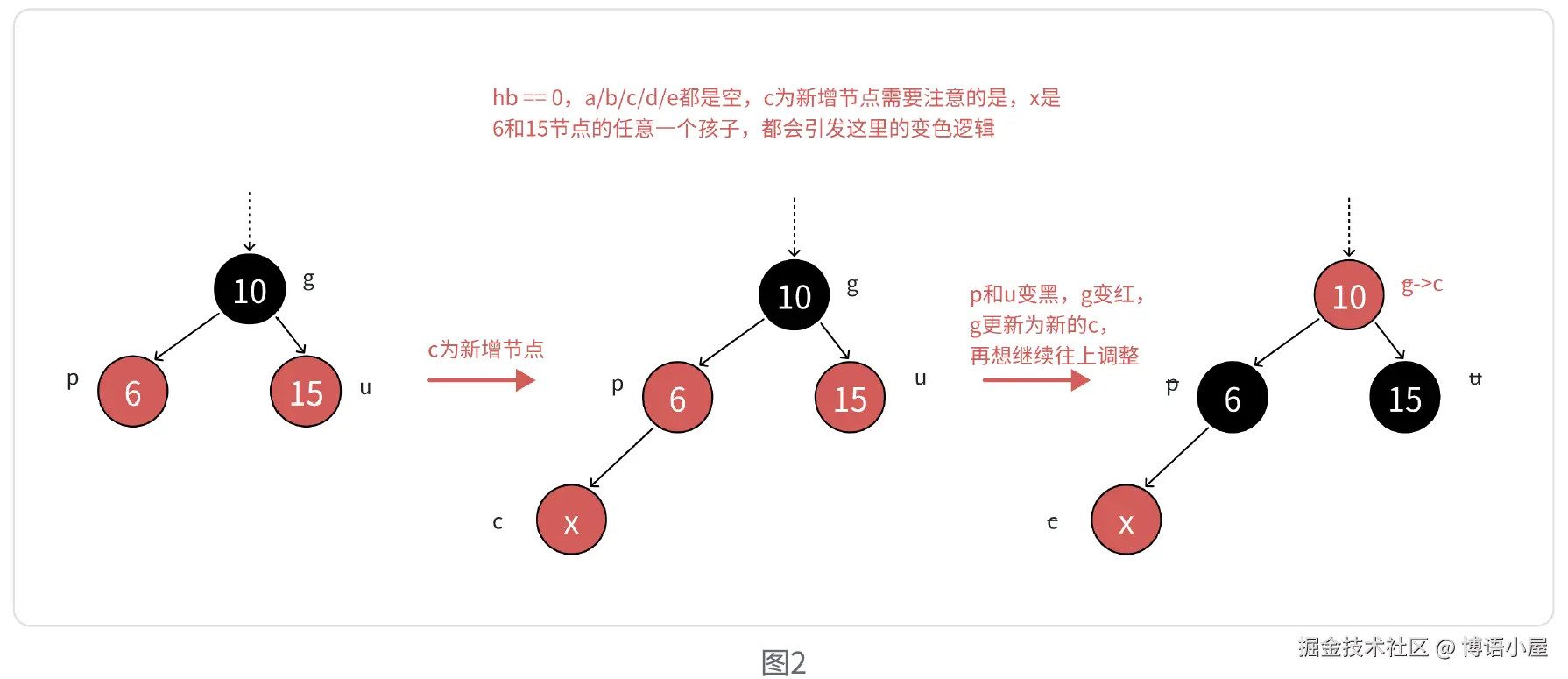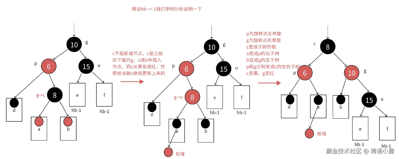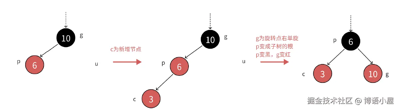 c为红,p为红,g为黑,u不存在或者u存在且为黑,u不存在,则c一定是新增结点,u存在且为黑,则c一定不是新增,c之前是黑色的,是在c的子树中插入,符合情况1,变色将c从黑色变成红色,更新上来的。