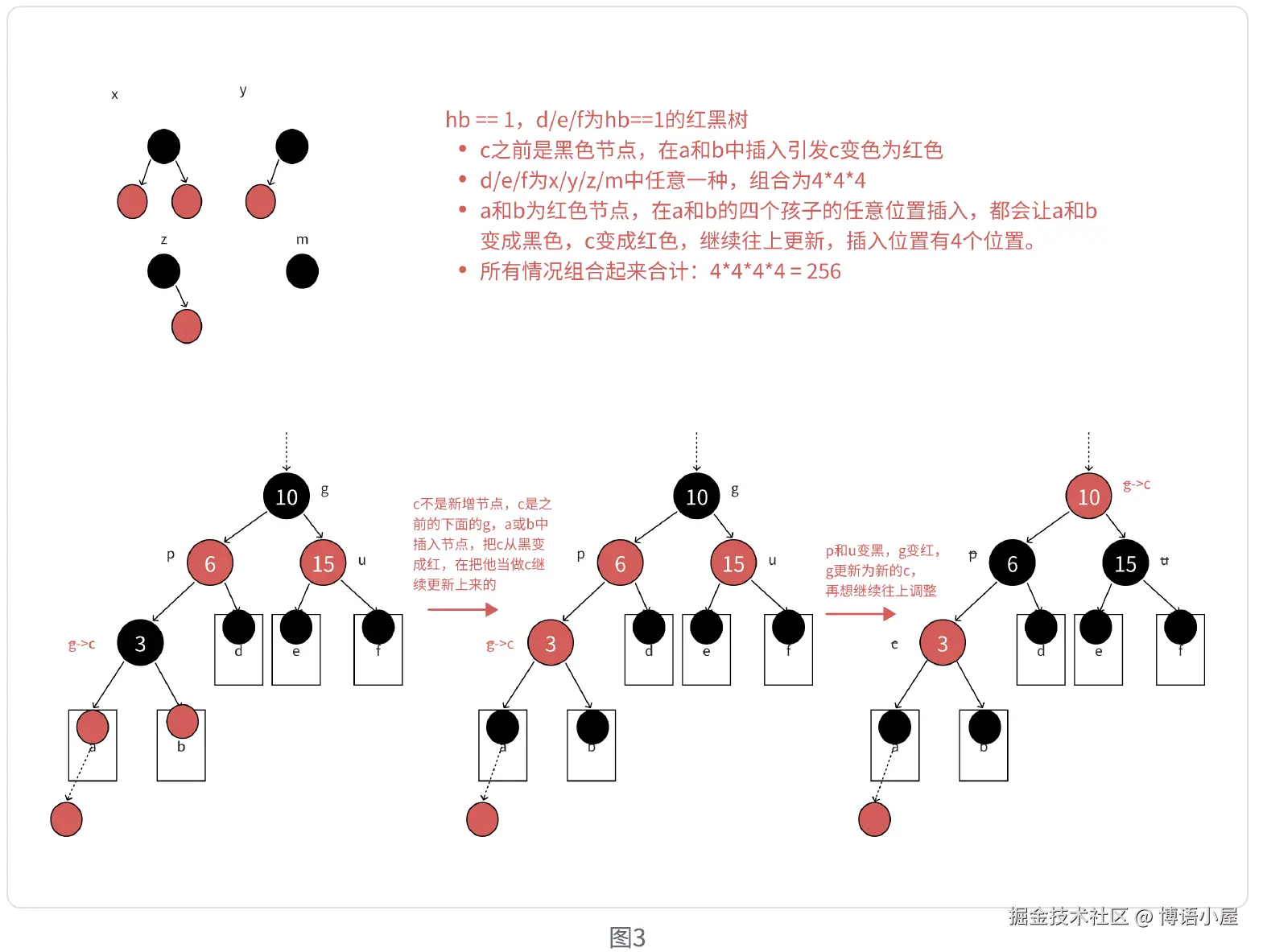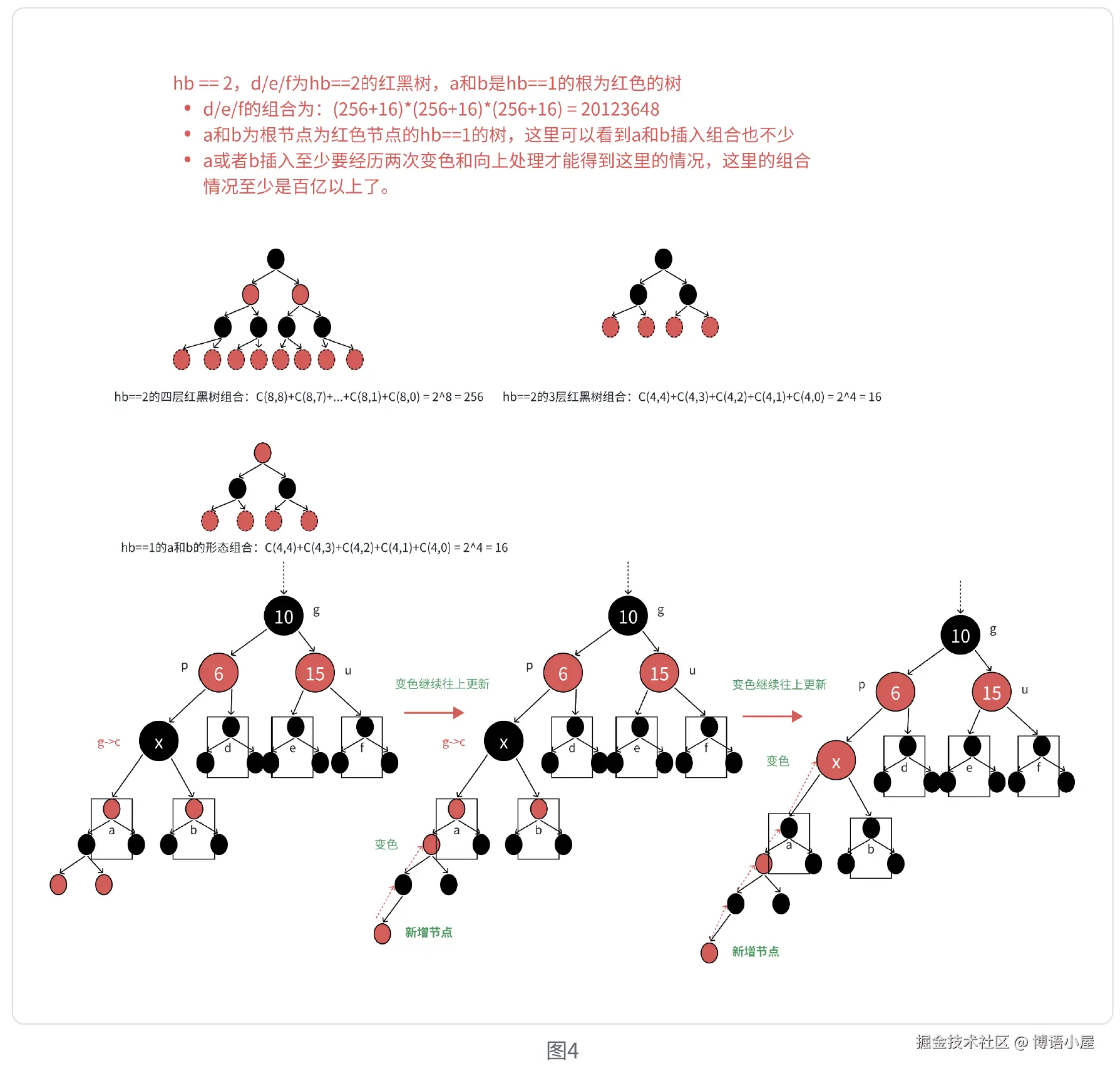 • 图2/图3/图4,分别展示了hb == 0/hb == 1/hb == 2的具体情况组合分析,当hb等于2时,这里组合情况上百亿种,这些样例是帮助我们理解,不论情况多少种,多么复杂,处理方式一样的,变色再继续往上处理即可,所以我们只需要看抽象图即可。