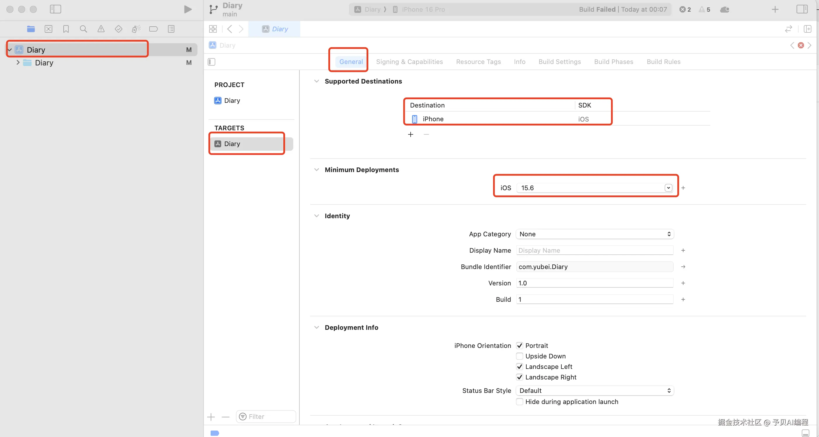 然后选择左侧工程文件夹,依次点击 General -> TARGETS 下的 Diary,删除其他平台,只保留 iPhone,最低版本选择 15.6,尽量满足不同系统的要求。