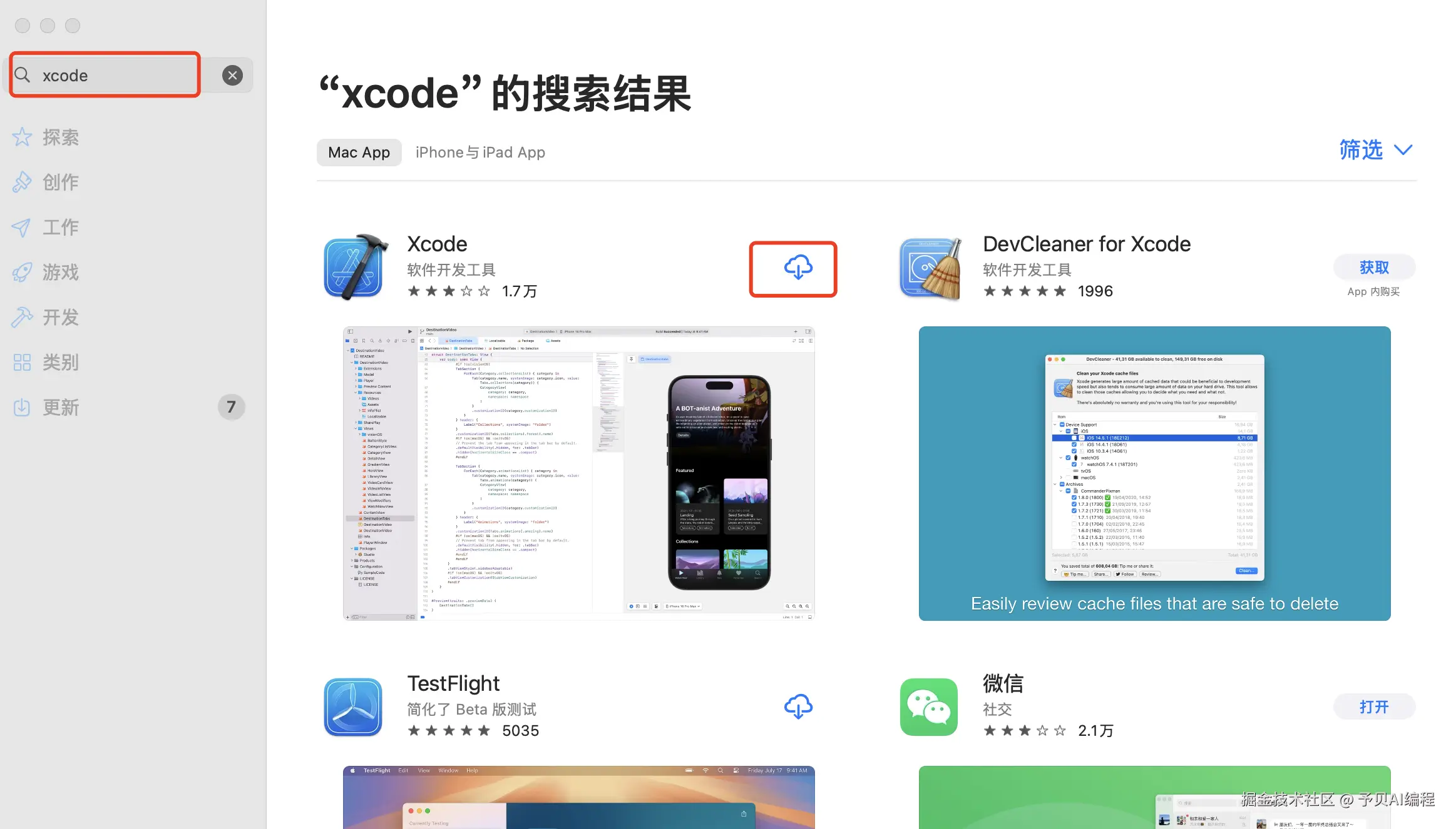 登录成功后,搜索 Xcode,找到后点击获取下载,下载需要一段时间,大概 3g 左右