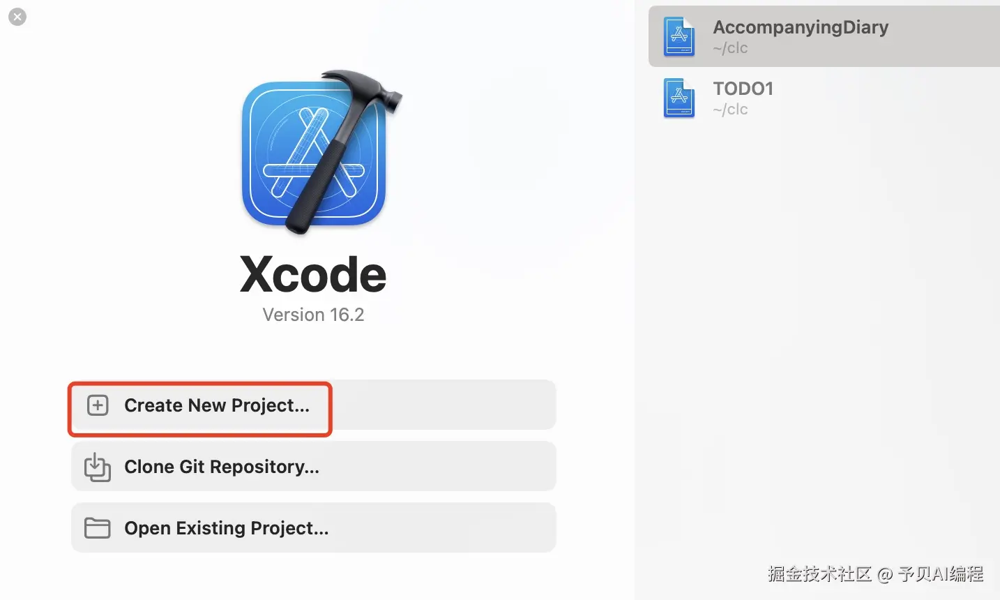 打开 Xcode,点击 Create New Project 创建新项目,新建的项目会在右侧展示