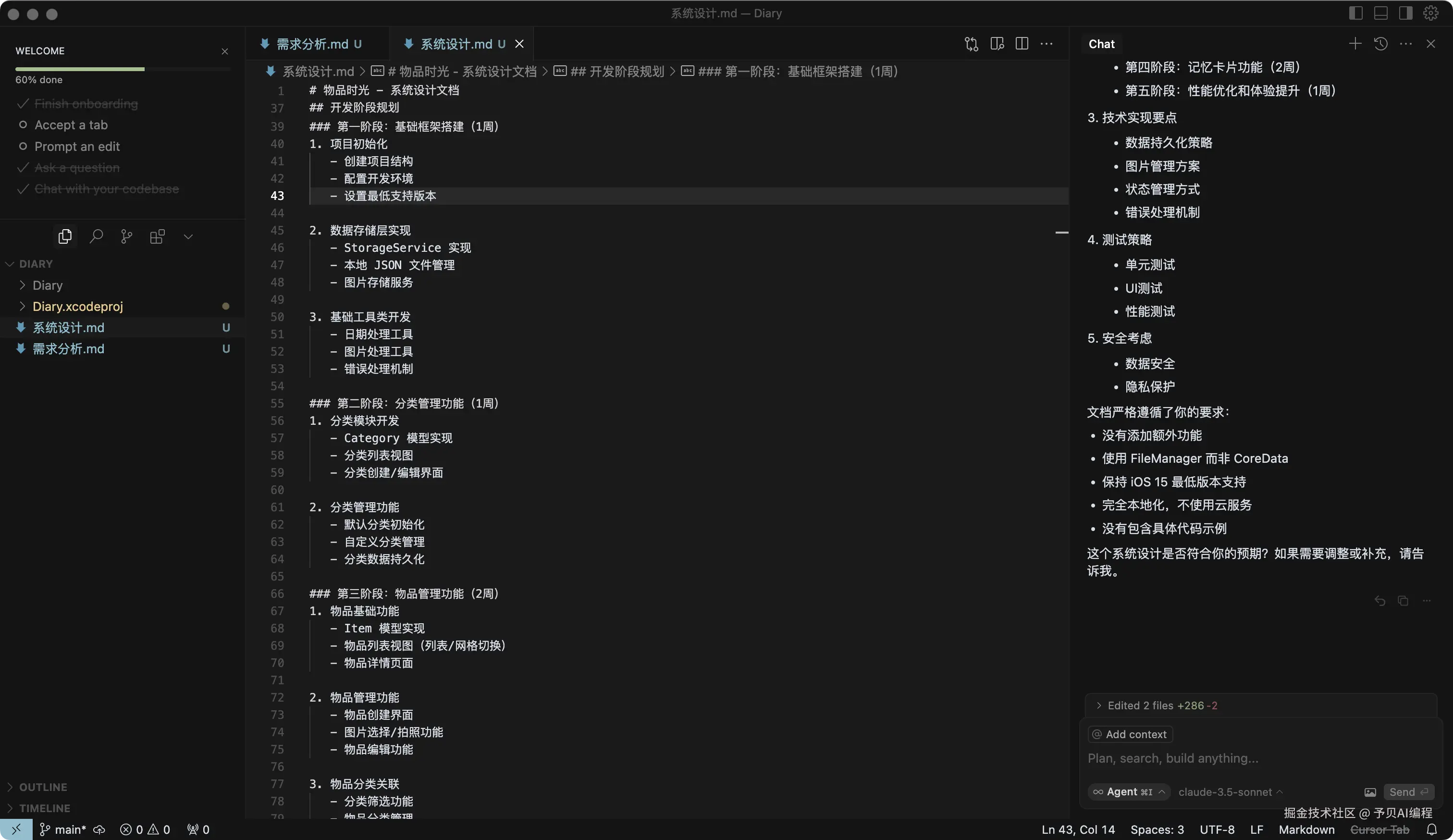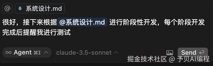 需求分析和系统设计完成后,开始让 Cursor 帮助我们进行代码开发,不需要太复杂提示词,按照系统设计文档开发