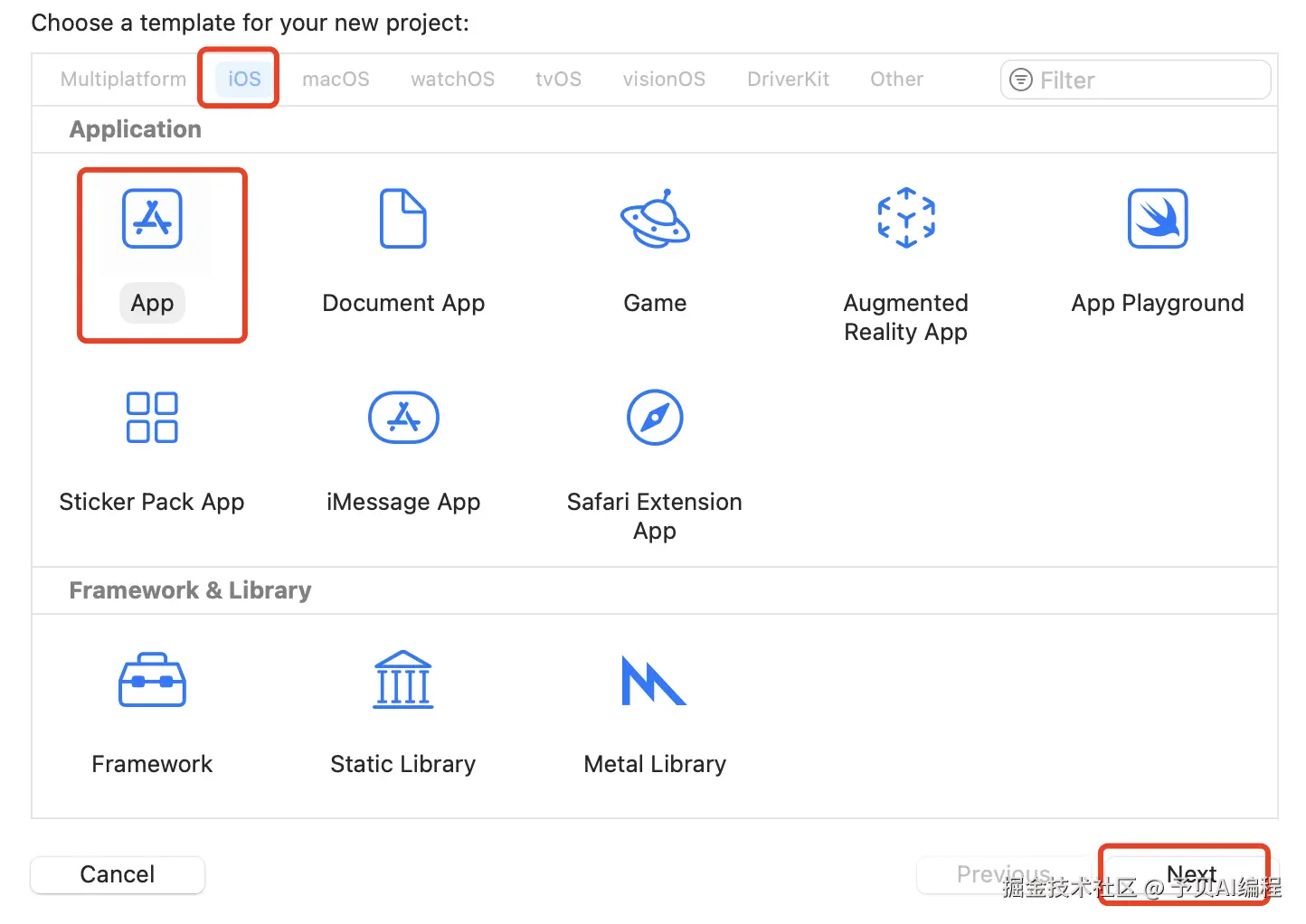 依次选择 iOS -> App,点击 Next
