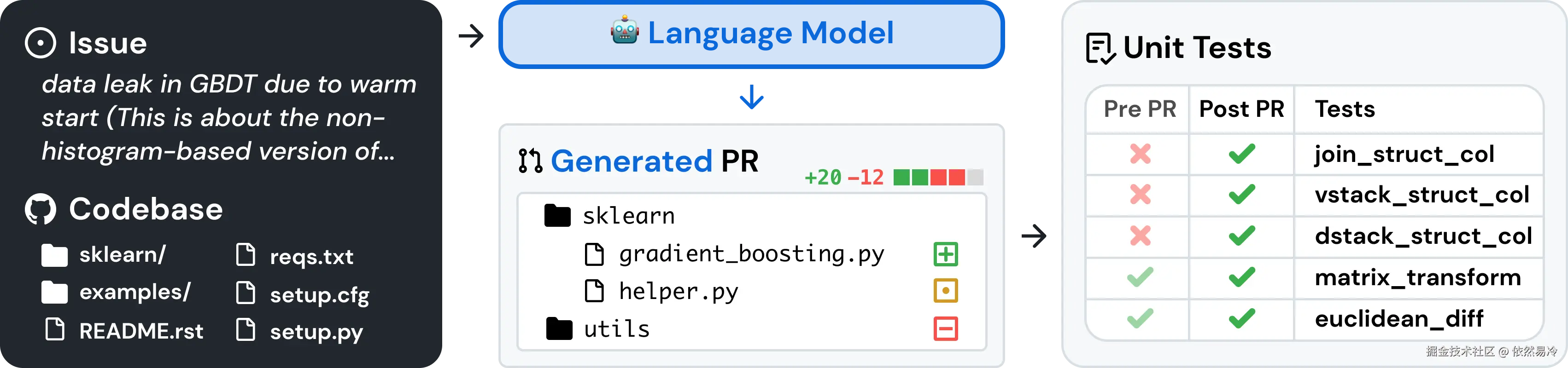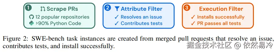 主要是从12个活跃的Python开源项目(如Django、Matplotlib)中,通过筛选 GitHub 上已解决的issue和对应的PR构建测试案例。每个案例需满足:成功修复了特定问题并附带验证测试case且原始代码库的测试覆盖率超过90%。