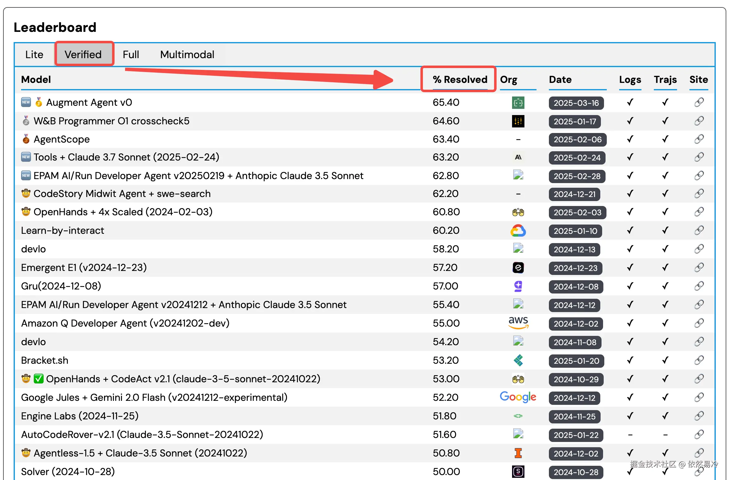 成功解决问题的比例,目前2025年5月最新的榜单第一名是近期很火的Augment了,后面找个时间介绍下。