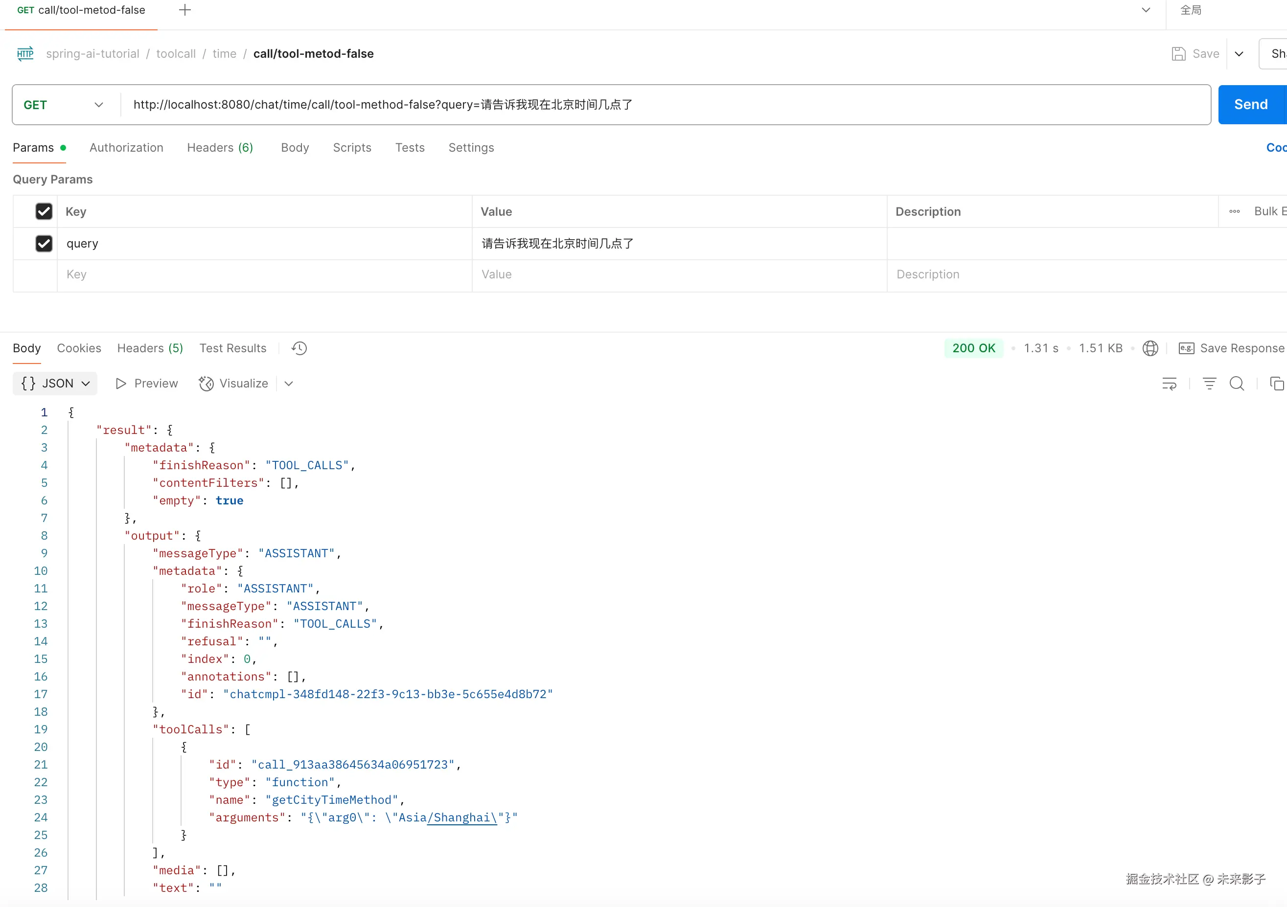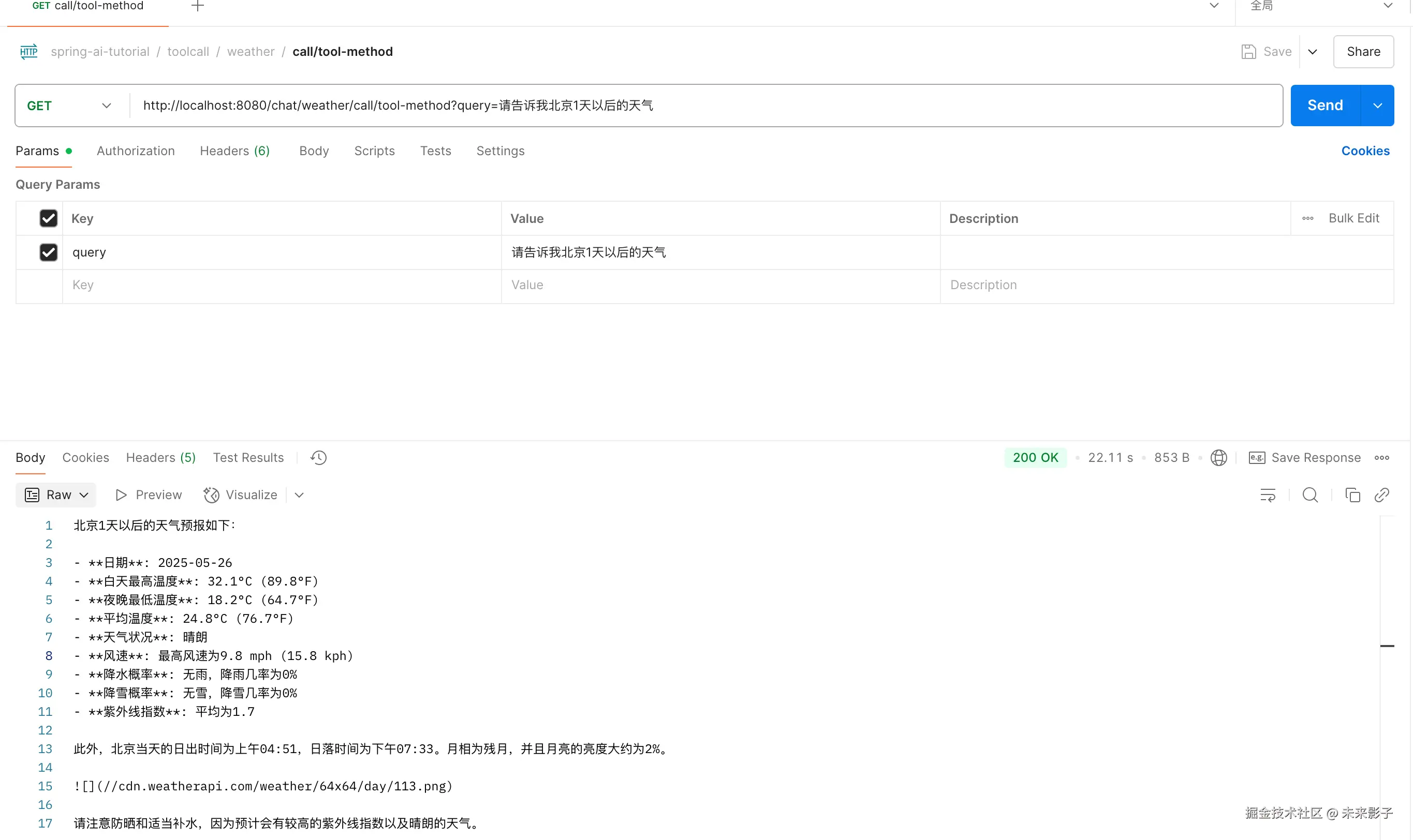 public String callToolMethod(@RequestParam(value = "query", defaultValue = "请告诉我北京1天以后的天气") String query) {
