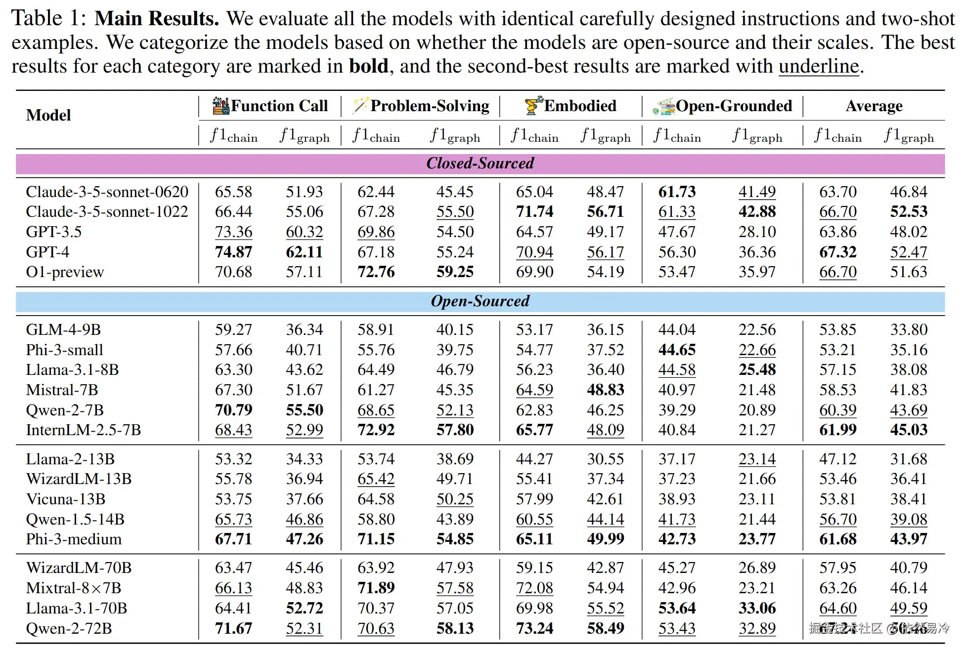 评测集包含问题解决(problem solving)、函数调用(function calling)、具身规划(embodied planning)和开放式规划(open-ended planning),并采用有向无环图(DAG)建模工作流。示例场景包括多步API调用、跨工具协作等。