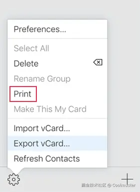 提示: 或者,在步骤 3 中,您也可以选择齿轮菜单下的“导出 vCard”,将联系人导入电脑,稍后再手动打印。您可能还想了解如何在 iCloud 上管理联系人。
