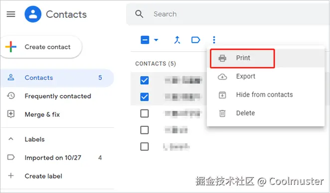 在电脑上访问 contact.google.com。使用相同的 Gmail 帐户登录后,勾选所需的联系人,然后点击顶部的三个点。接下来,选择“打印”,并在调整打印设置后打印 iPhone 联系人。