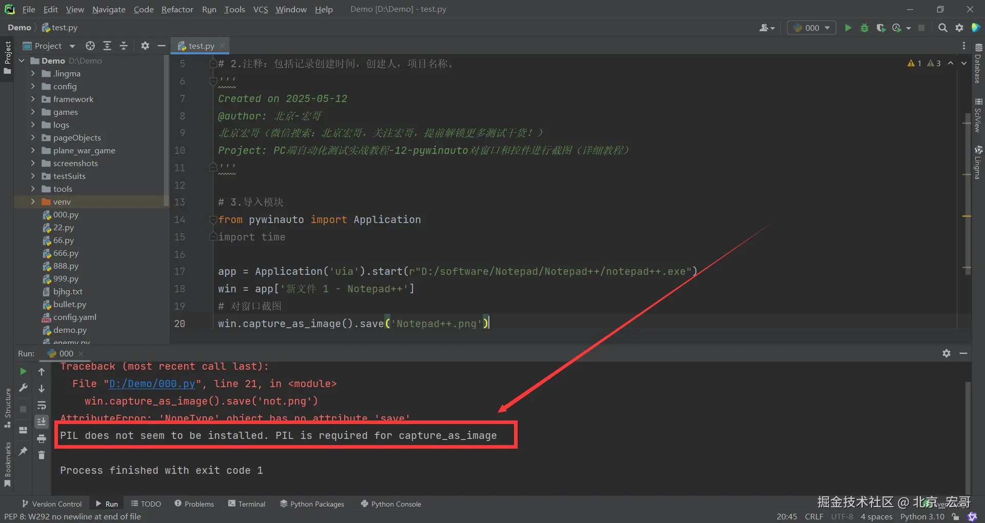 2.由宏哥介绍前边的截图方法,我们知道需要安装PIL模块,宏哥这里没有安装看看会不会报错。如下图所示: