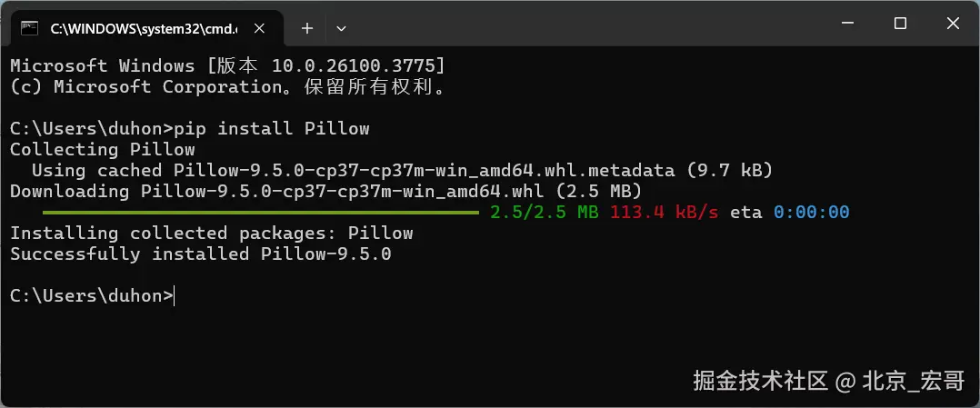 3.安装PIL模块。命令行:pip install Pillow ,如下图所示: