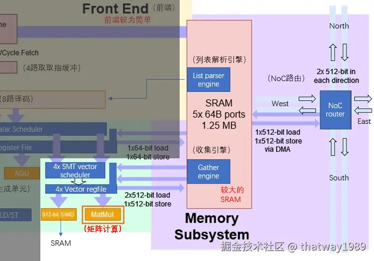 - 执行单元:具有2路ALU和2路AGU,以及针对向量/矩阵计算的512位SIMD和矩阵计算单元(分别执行512位向量计算和4路8x8矩阵乘法)。其中矩阵计算单元是D1芯片的算力主体。(在下一节具体介绍)