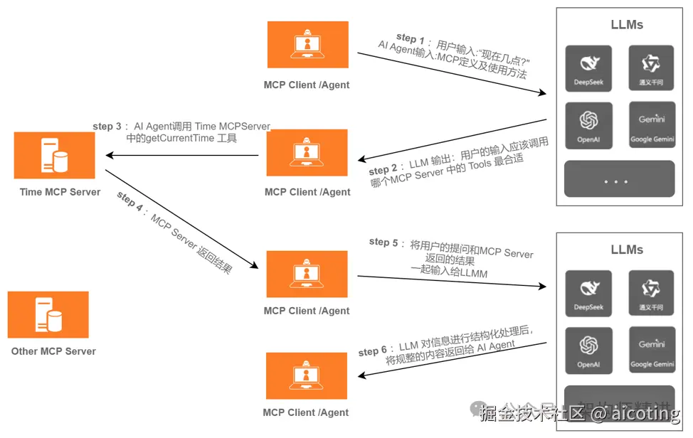 可以看到上述步骤中Agent(即客户端)提出请求后,MCP之后的所有步骤对用户都是透明的,最后得到AI工具的回答。