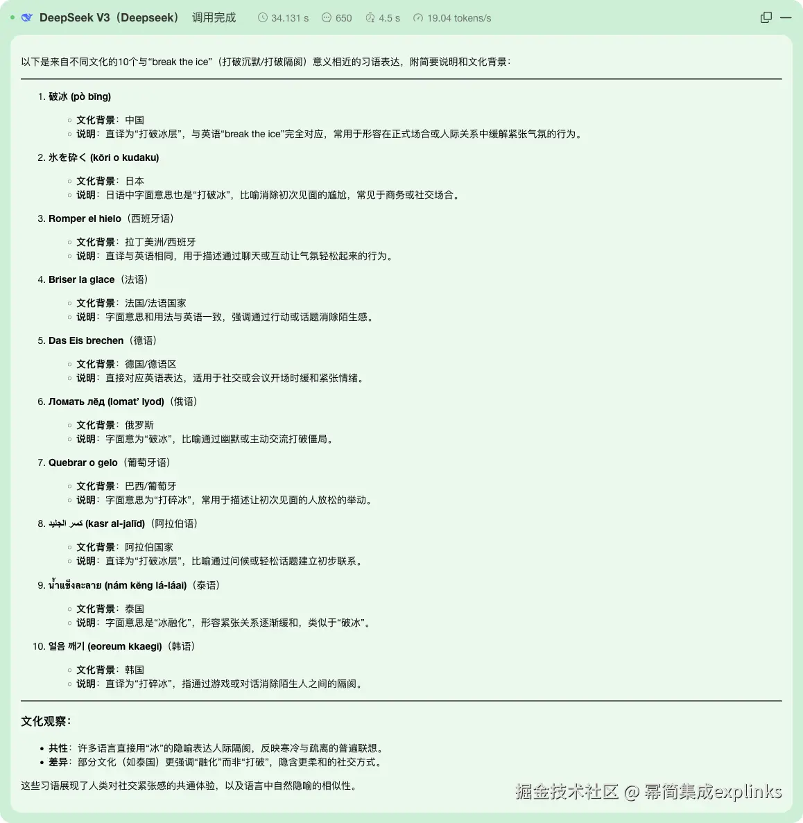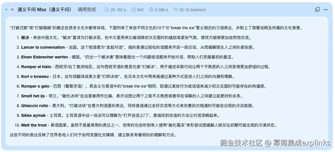 通义千问 Max输出结果准确捕捉了跨文化习语的多样性,而DeepSeek V3则提供了更丰富的文化背景和具体语境,两者均有效地展示了如何“打破沉默”
